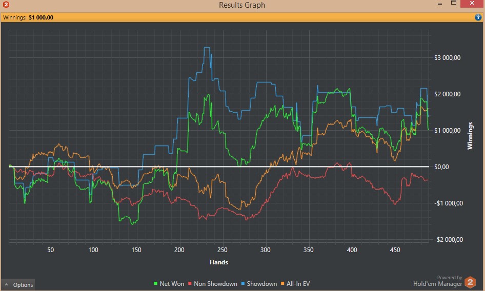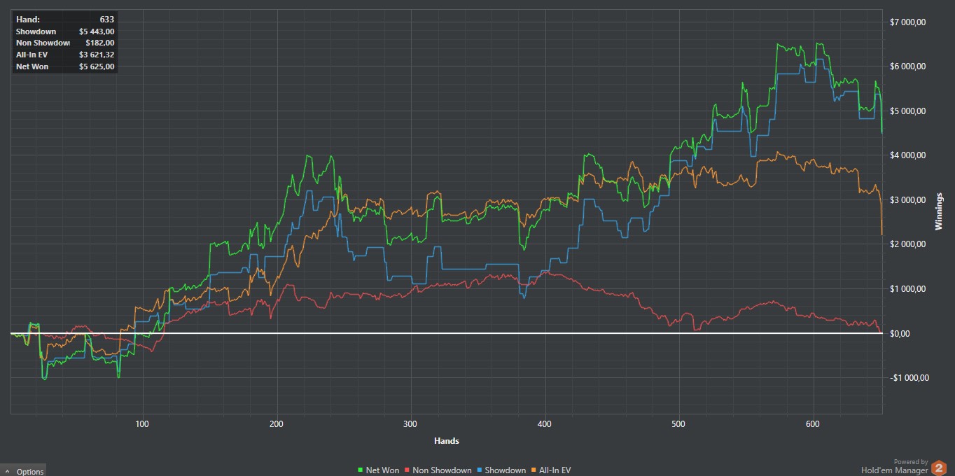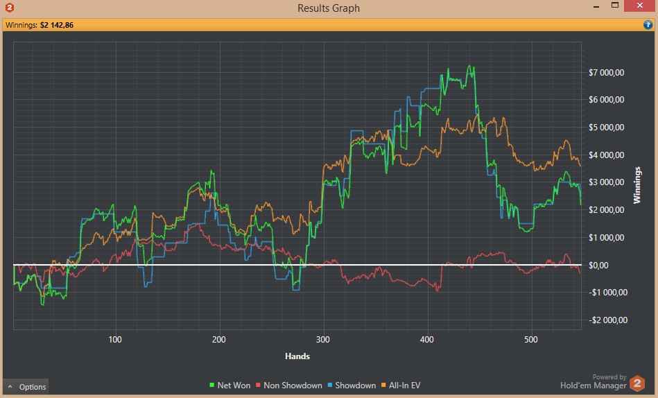 Отыграл 30 туриков, хотя мне казалось, что больше. Судя по хму, заняло времени суммарно 4 часа. График можете видеть. По ощущениям - пиздец какой-то - очень не привычно. Статы у меня конские вышли. Это впип и пфр на 2 пикче. Много бомбил на эни ту префлоп рейзами в нитов. Первый пфр с СБ тоже на эни ту делал с целью оценить оппа, проставлял многие флопы, подходящие на мой взгляд. Изолейтил очень лузово для инфы ещё... Если честно, чувствую себя фишом, но поляну гораздо большими фишами ощущаю. Господи, какие же там обрыганы играют, хотя это не удивительно, конечно. Хотя и относительно адекватные встречались. По ходу сессии обозначил главные непонятности:
