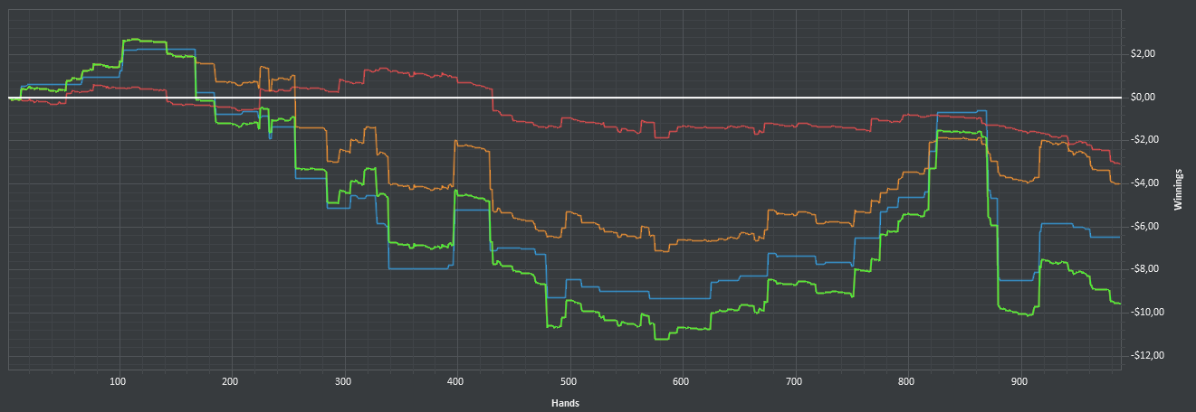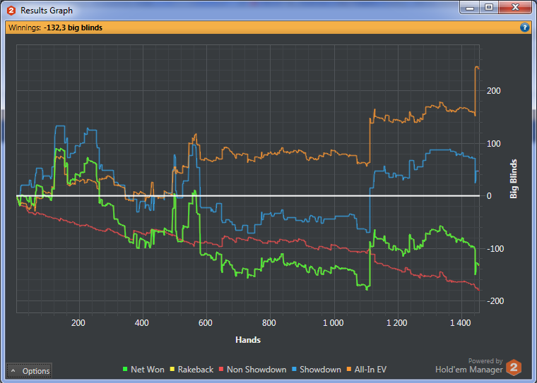 Я не знаю, что делать дальше. Осталось всего 10 долларов. Вы можете поинтересоваться, почему ev почти на месте. Все очень просто - оппам доезжает не только на коинфлипе, но и когда разыгрываем постфлоп. И я не могу понять, когда из "далеко впереди" слетаю на "далеко позади". Нет, правда. Меня ебали с любой рукой. Выебали, когда флопнул флеш - дважды! И оба раза выебали. Ебали, собирал я хоть допер, хоть стрит или трипс. Оппам похуй - им доезжала нужная карта, на терне или ривере, а я и не догадывался, что сейчас буду выебан. Меня ебали с тузами и королями - пушил я их на префлопе или слоуплеил. В первом случае ev идет вверх, во втором - вниз, в среднем - остается на месте, теперь понятно? Вот, такие дела.