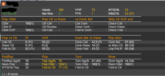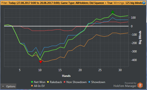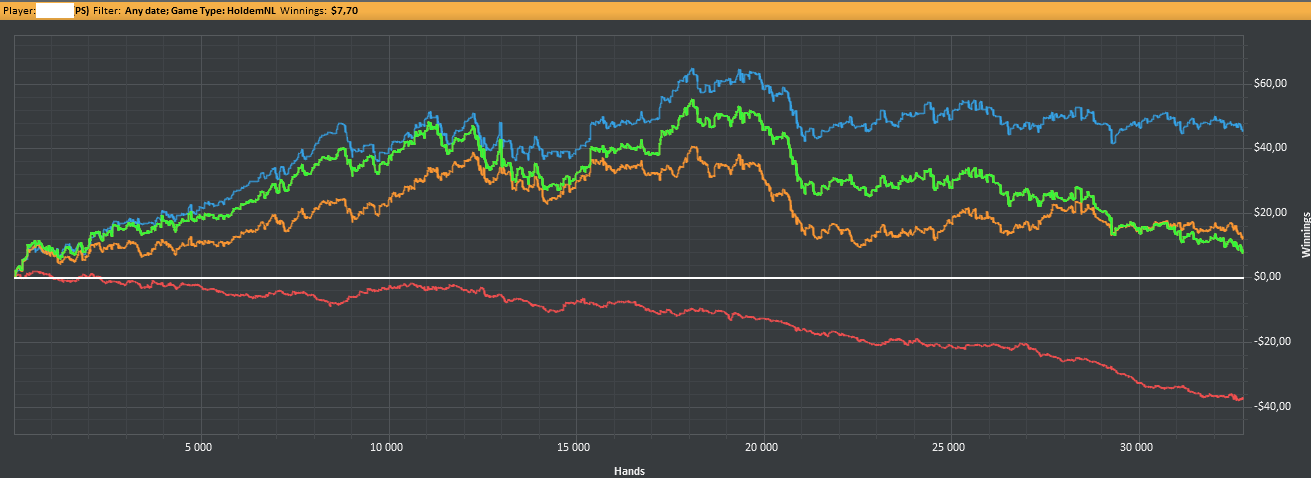 После 3000 руки начались сильные волнения - то результат моей динамики с эпичным фишем со vpip и pfr в районе 50. Я сидел в позе на него и все равно умудрился отдать деньги, лол. Из-за него же сговнил ев линию, а от неё я возбуждаюсь больше, чем от зеленой. В итоге фиш срулил с деньгами, козел!, а я успокоился и продолжил катать авс покер. Разобрался с худом -- что означают основные статы и все такое. До сего дня он просто висел и не вызывал моего интереса. Классная штука, не стоило пренебрегать. Разбор рук зря отложил, сейчас их стало ещё больше. Завтра займусь и скину итт.