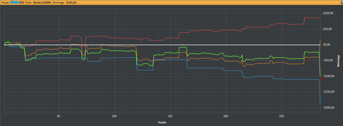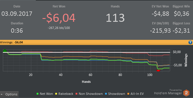 Нет поводов для радости. Первого получил 6$ за место в таблице Elementary League. Пикрил мои потуги в следующие 2 дня Вчера, начиная примерно с 300 руки, испробовал последний шанс: фишовая игра со впипом 80. Дистанция в 350 рук это ничто, но я натурально охуел, насколько вышло минусово. Только ЕВ зря на 2,5 стека опустил. Вообще, такой широкий спектр могу себе позволить только на баттоне - открываюсь минрейзом и основные надежды возлагаю на фолд эквити - задешево и без боя спиздить блайнды. На последний доллар сначала сыграл S'n'G на 180 рыл, где вошел в призы и получил 1.06$, лол. Потом в Bouty Builder - mtt с прогрессирующими наградами за выбивание, где и слился. Более халявных денег в обозримом будущем не предвидится. Пришел к выводу, что было ошибкой вкатываться с 5$ - даун сразу бы их уничтожил, ап спровоцировал бы переоценить свои силы и уверовать, что делаю все исключительно верно. У меня второй случай. Маленький бр, к тому же, сильно ограничивает тактическую свободу - будешь очковать лишний раз кинуть проверочный кбет, зафлоатить или вскрыть блеф. Хуйня какая-то выходит, а не полноценная игра.