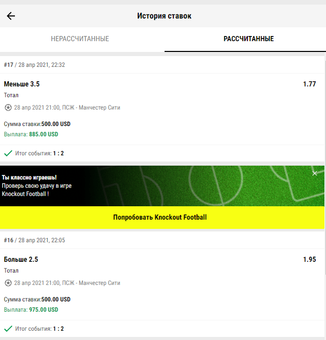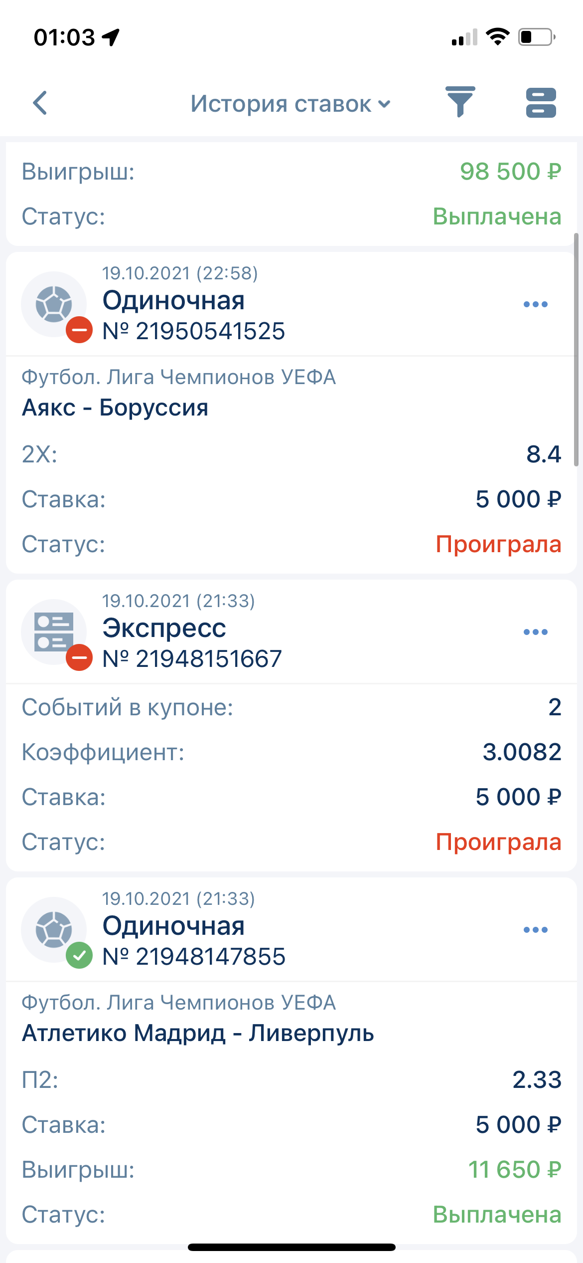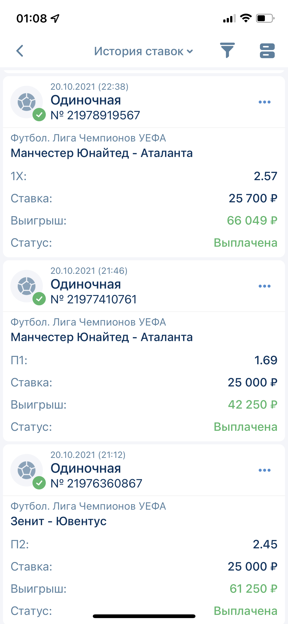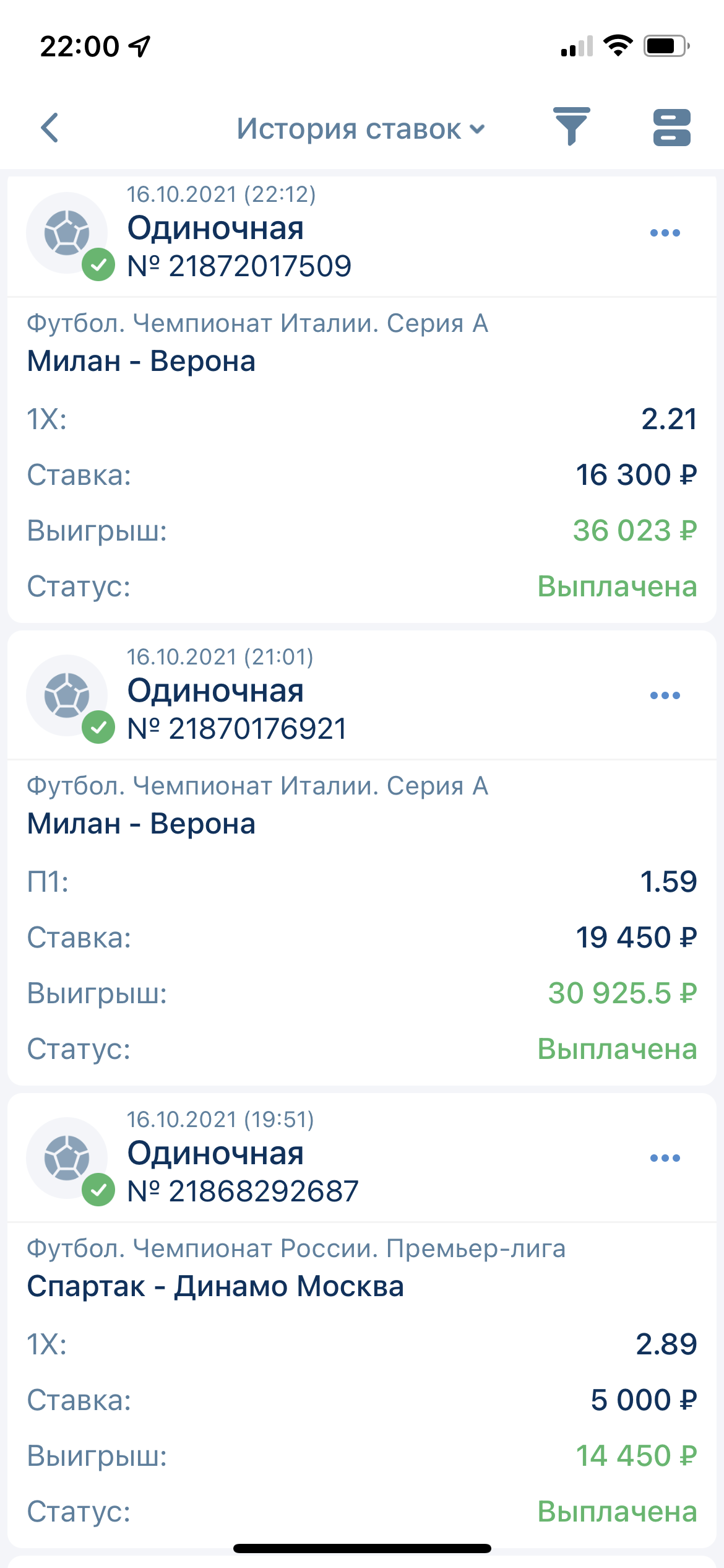 Однажды я сделал ставку на последние гроши и выиграл 27к. Хуй знает что там за маловероятное событие было, но это был футбол, год 2015 наверно. Было пиздец как приятно умножить свои 300 рублей в десятки раз, но я подобных раскладов больше не встречал.