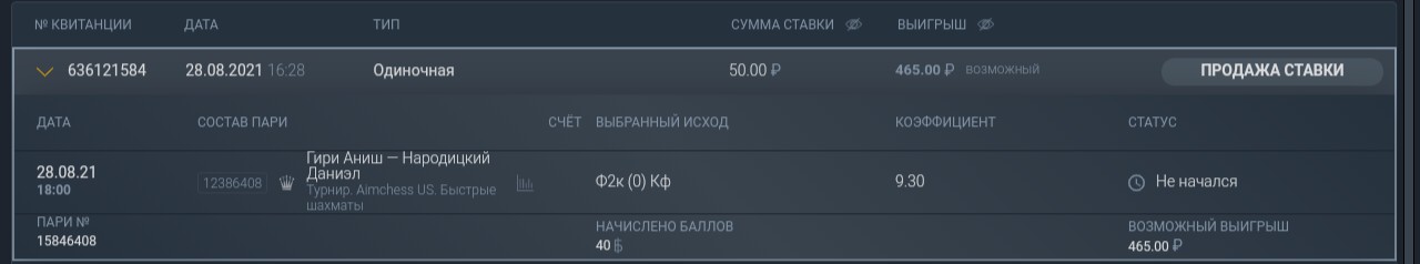 Стрёмно брать сегодня шахматы, но попробую ради интереса. Буки почему-то свято верят, что в партии Уэсли Со - Шахрияр Мамедьяров будет пат (самый низкий кэф на ничью), а мне вот кажется, что будет П12 за кэф 2.94.