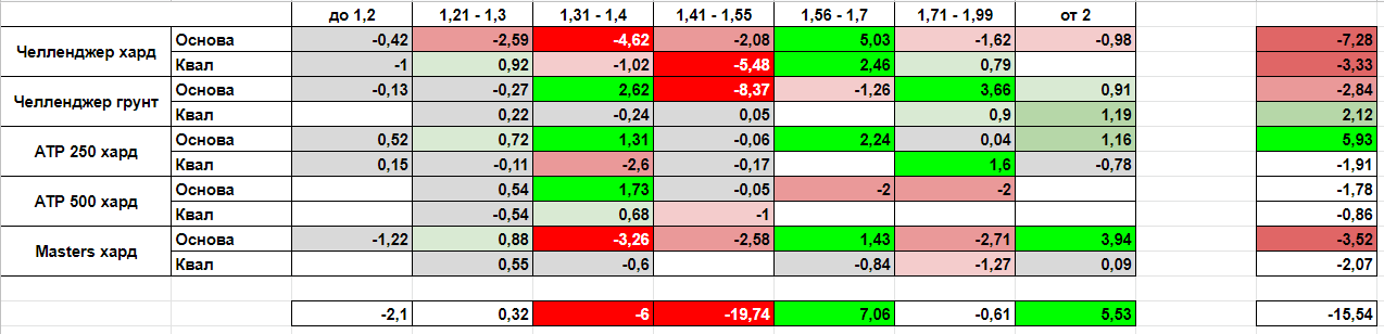 На пикриле вы видите таблицу с результатами моих изысканий. В столбцах - кэфы, в строках - уровень соревнований. На пересечении - прибыль или убыток в пересчёте на флет. Например, ставки на кэфы в районе от 1,21 до 1,3 в основных сетках грунтовых челленджеров вогнали меня в минус на 0,27 номинала. А ставя на кэфы выше двойки на хардовых мастерсах, я заработал бы более 4 флетов.