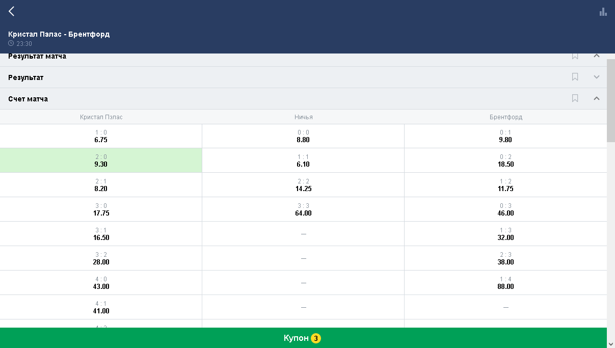 Кэфы повыше - от 1,56 до 1,7 - должны отпугивать игроков, но у меня они заходят с неплохой регулярностью. Правда, выборка мала. Будем смотреть дальше. Здесь результат +3 флета.