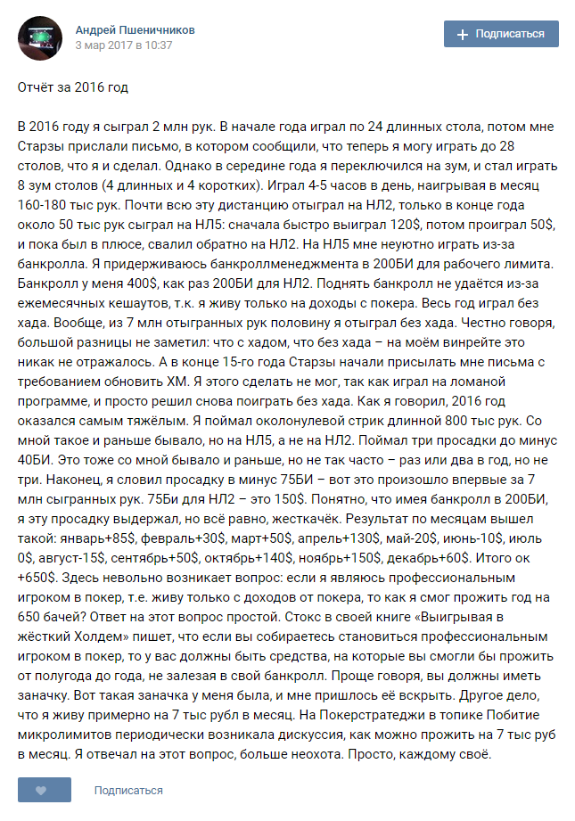 А, и забыл спросить, как понять, что пора переходить на следующий уровень? Я не про БРМ, а про уровень игры? Например, в NL2 я чувствую себя вполне комфортно, захожу с 80 центами, выхожу со стола с 4-6 долларами. Бывает, что больше получается, но потом начинаю принимать неверные решения на "подъеме", веря в свою непобедимость разыгрываю мусорные руки, которые до этого скидывал. Возможно, конечно, мне еще не попадался стол на NL2, где сидят реги и ловят таких фишей, как я. В общем, спасибо Анону, который посоветовал почитать статьи на покер стратеджи или джипси, а не книги. В принципе, особо ничего нового не узнал, просто начал придерживать стратегии. Раньше я закидывал небольшие депозиты, но начитывшись Суперсистемы, слишком верил в себя и свою везучесть, постоянно крутились фразы в голове из книги, типа: "Если я выиграл раздачу, я буду обязательно ставить во второй, если я выиграл вторую раздачу - значит у меня полоса, я также буду ставить в следующей".