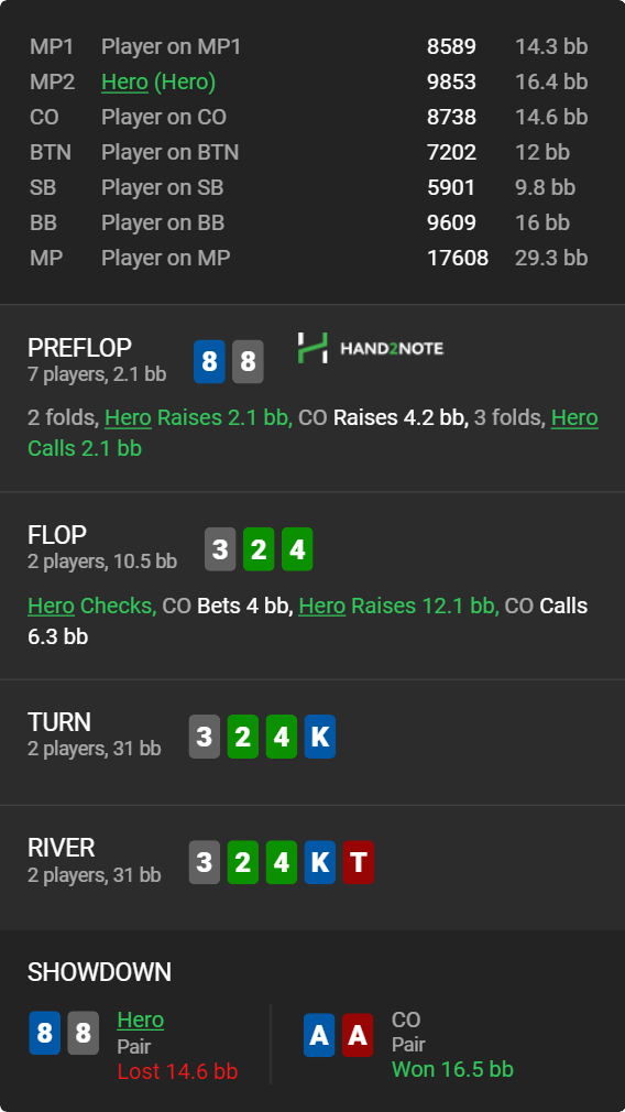 одна из тех раздач, где ты понимаешь, что играешь против тузов после мини 3-бета, но все равно не можешь выкинуть по такому борду, надеясь что это фиш и таким образом 3-бетил оверкарты. ну а кто бы справился здесь с пасом?