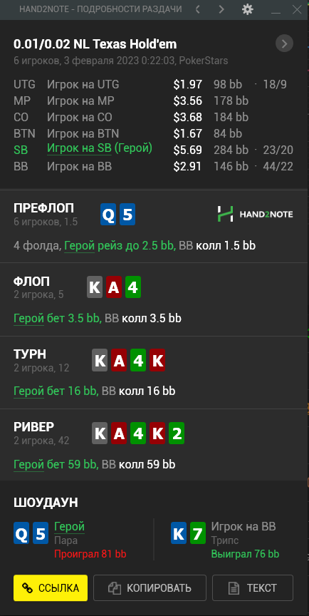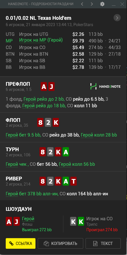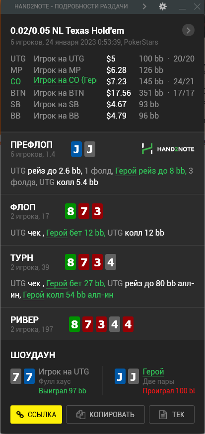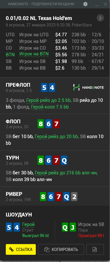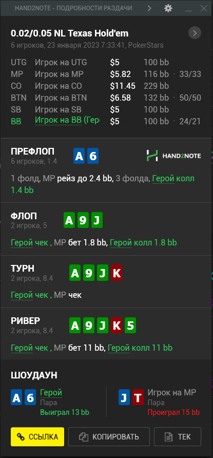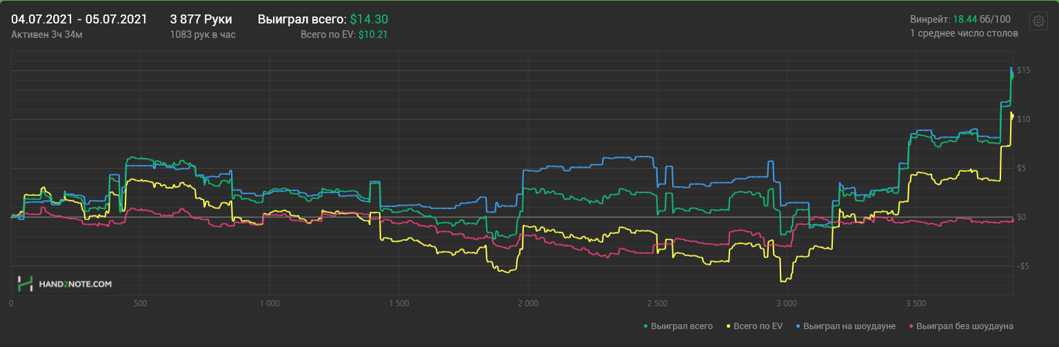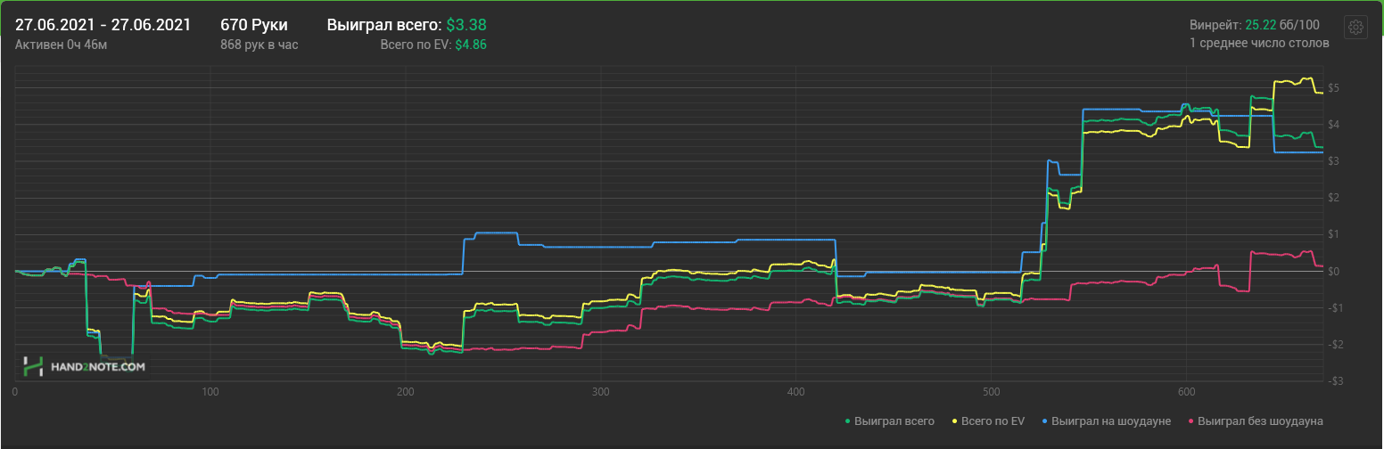 Доиграл кароче до талого - пока не поймал джек, но денёк всё равно в минусе из-за разрыва ev с реальным выигрышем. Плюс под конец аномальная хуйня, отметил стрелочкой, когда я с гавной по кд упирался в JJ+, а мои JJ+ вообще не проплачивались.