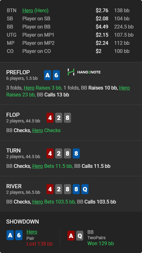 ЕБАТЬ. Я думал тут все ссут тонко вельюбетать ривером, оказывается не все. Удивительно, учитывая, что огромная часть сильных тузов тут в 3бете префлоп, а мелкие могли доехать в допер. Мб тут рейзить ва-банк надо было на ривере, я блочу часть Ax, в том числе доперы, а так же единственную комбу 8♧7♧, с которой он бы тут так играл.