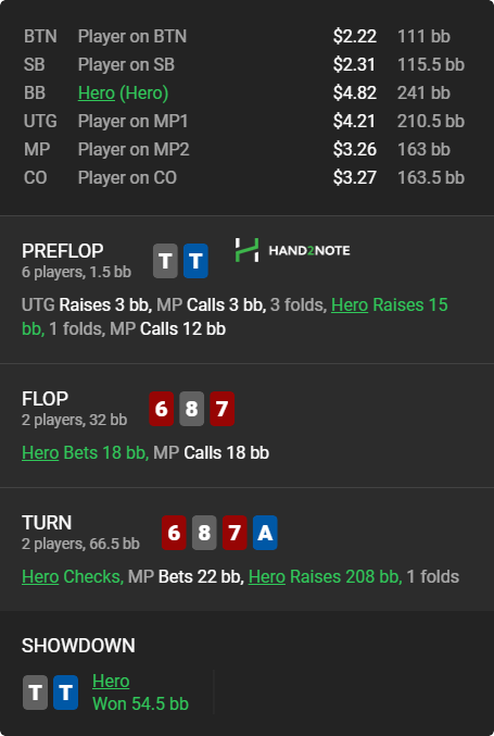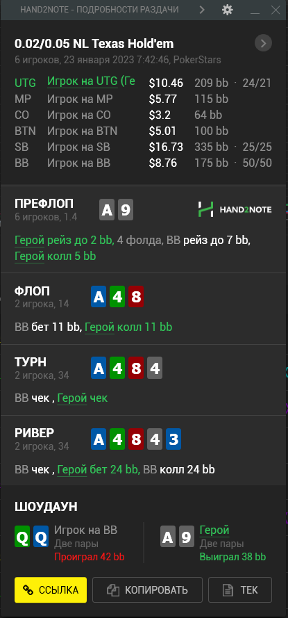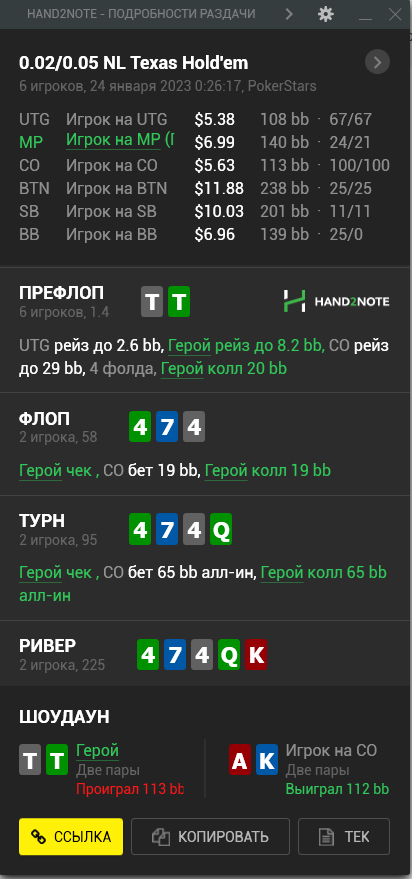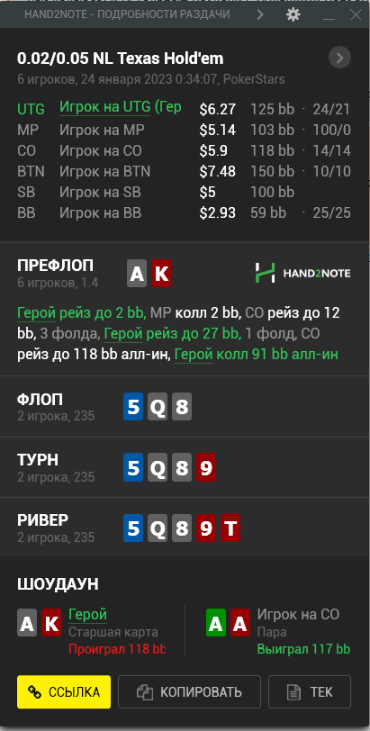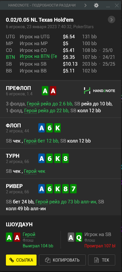 А тем временем ваш покорный слуга опп продолжает чекать с тузами, а оппы продолжают его обссыкать. С каким же говном они залезают под 3-4-беты, и ведь доезжает!