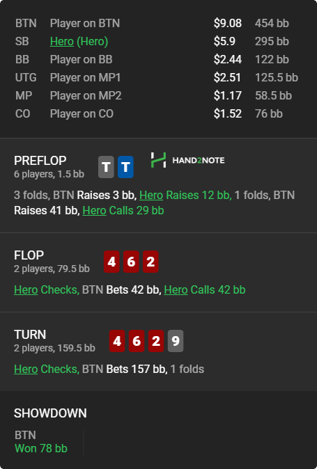 5) Я ваще не помню когда в последний раз так тупо дарил стек сету в 3бет поте. В доски дерьма ебаного просто чекаю с оверпарами, даже с тузами. А дальше за 2 улицы без позы у оппа крайне мало шансов с меня добрать дохуя. Во время раздачи подумал, что это же валеты епта! Им нужна защита от оверкарт. Только вот на терне уже оверкарт у оппа не остается кроме фд и можно перестать баррелить.