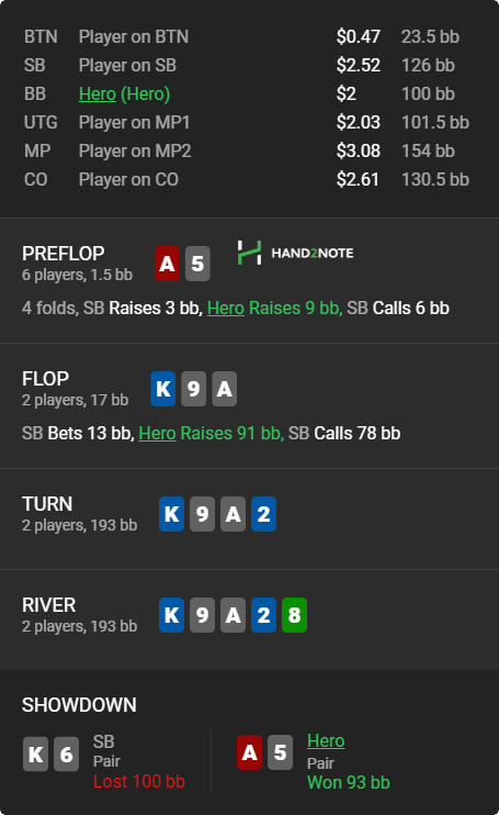 Думал подвыбить оверкарты старше, но опп не зассал и познакомился с кнопкой колл, малаца. В зеркальной ситуации бы и сам не выкинул, пожалуй. К слову, о чеках с тузами >>50149, представь тут прочекаться а на ривере выиграть стек с нихуя у всех Ах