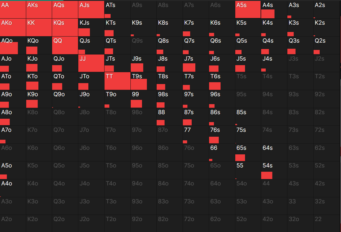 >>50144 Думаю, тут с частотой 100% AQ запихивать надо было - с блокерами на AK, KQ. Велью у меня тут дохуя AK, AA, KK, A3s - итого 21 комба. Добавить 16 блефов AQ - и нармас.
