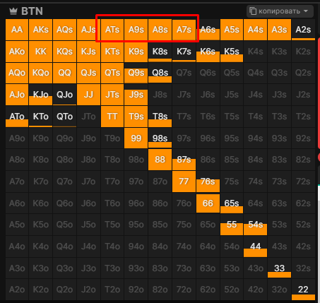 Внимательнейшим образом шас ознакамливаюсь с визардным спектром BB 3bet vs btn. Почему он трибетит А7o-АTo, но почти не трибетит A7s-ATs, ведь очевидно мастевые тузы сильнее разноцветных. Почему он сцыт трибетить с Q9s, но все дамы слабее есть в спектре?