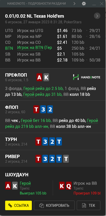Пересмотрел ша раздачу и охуел что недобрал 4бб, походу мисскликнул и нажал треть пота вместо полпота, итого когда доехало - недобрал, недоехало - лишние 10бб въебал >>50085, пиздец короче, теряю винрейт за просто так.