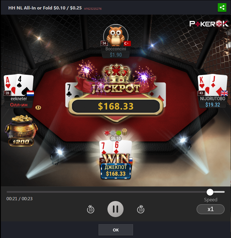 Сегодня опять зашел в покерный клиент играть all in or fold и очень быстро половил своего джек-пота, даже 10к рук не пришлось наиграть. По кассе выходит +172.65$, ну такую маленькую дистанцию в день играть это не дело, ша отдохну и ближе к ночи буду гриндить.