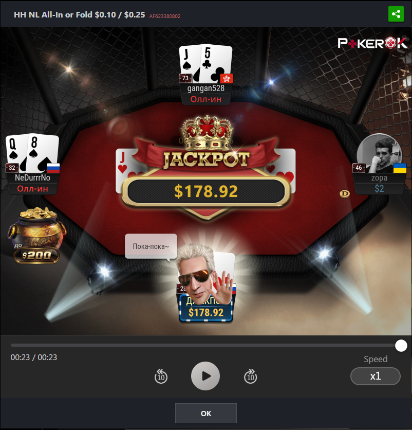 На данный момент пул джек-пота коцаный, приз будет 135$ если выбить, а это мало, так что сегодня, пожалуй, без пушфолда поживу ну или полудоманю немного на самом низком лимите.