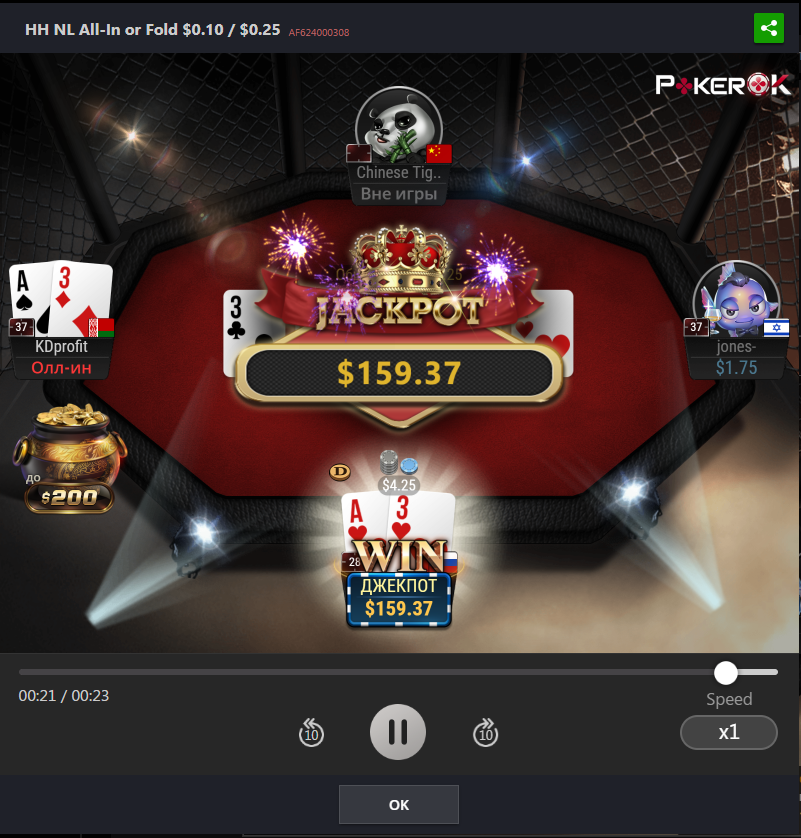 Сел играть, но вдруг человек со старших лимитов раздербанил джек пот пул, уменьшив его на 10%, так что продолжать стало невыгодно, катапультировался со столов.