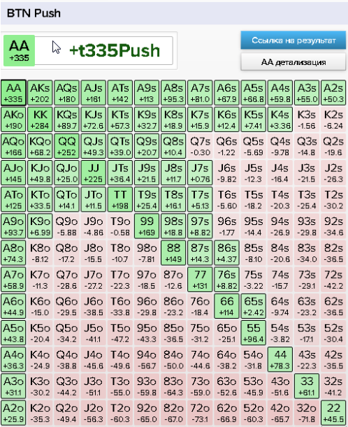 >>50657 >какие руки ты посчитал не обязательными для пуша с КО или БУ допустим В качестве RFI для пуша обязательны все руки с реддита. Под вопросом только 64s с CO, как-то это контринтуитивно, лол, что такая рука в+ играется с ранней. Так же под вопросом низ спектра на SB типа T7o. Может в нормальной структуре блайндов это и прокатит, но на моем лимите структура не 0.5бб/1бб, а 0.4бб/1бб, то есть пушить надо лучше, чем в -40бб/100, на редите посчитан пуш который будет лучше 500bb/100. Но это всё цветочки, на дисерт самое вкусное. Сейчас нет сил писать, го потом напишу.