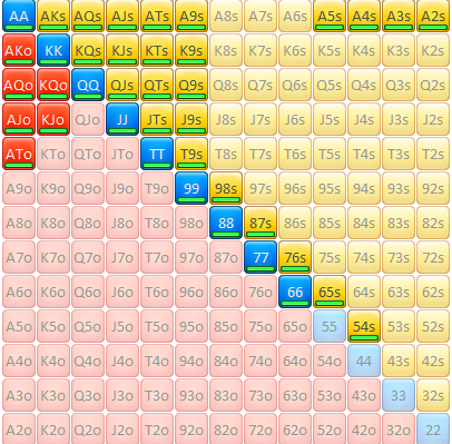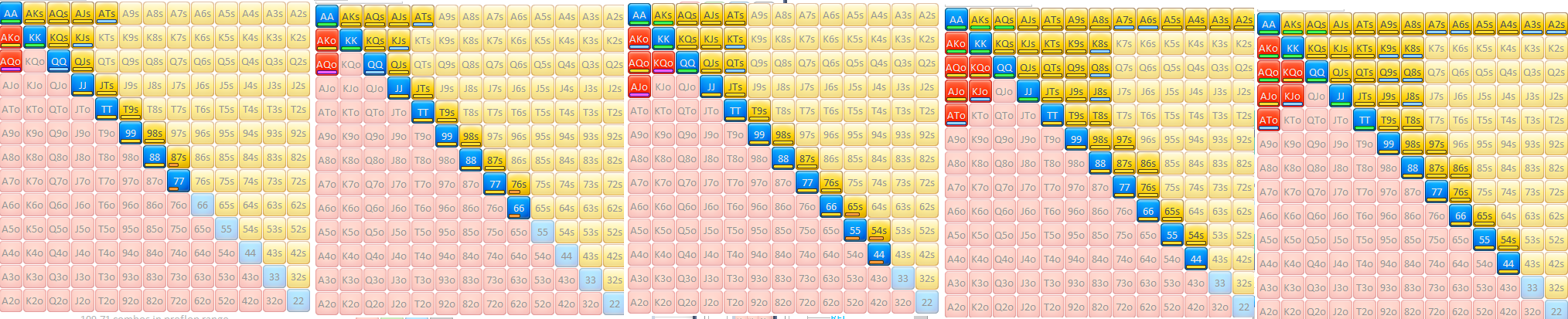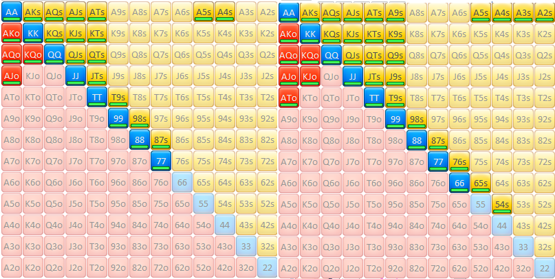 Защита на 3бет, зелёное и красное - 4бет, серое 4бет без позы и колл в позе, желтое - колл, оранжевое колл только в позе.Да у меня почти одинаковые ренжи в ранних, но кого это ебёт? Мне так удобно.