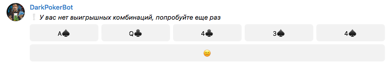 Луданы, запилил игровой автомат(видеопокер) в телеге, зацените, зайдет/не зайдет. Можно и на фантики поиграть, Можно на реальные (ставки пока копейки 10-50 рублей. Все через qiwi. Оцените хотя бы интерфейс, как вам такое?