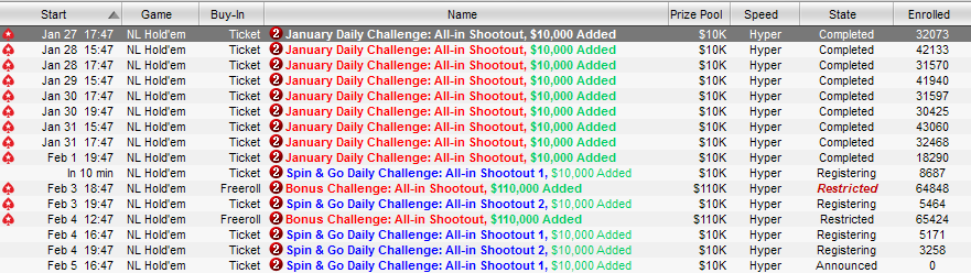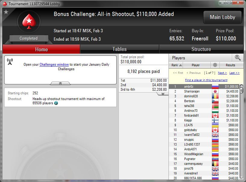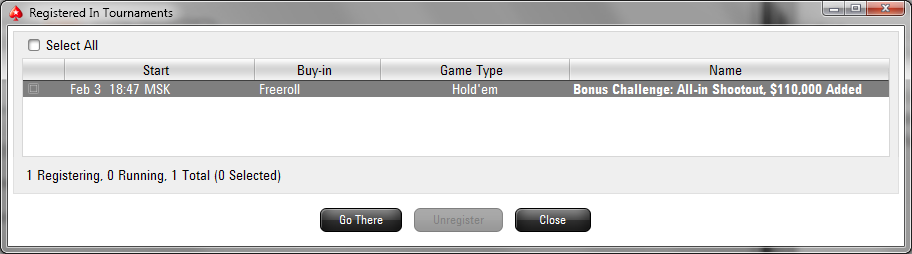 Максимальное количество участников турнира $100K Bonus Challenge All-in Shootout составляет 60 000. Сразу после выполнения 10 заданий Вы будете автоматически зарегистрированы в нем. Поэтому рекомендуем выполнить 10 заданий как можно быстрее. Все игроки, которые выполнят 10 и более заданий, но не смогут попасть на турнир $100K Bonus Challenge All-in Shootout, не позднее 07:59 МСК 5 февраля (23:59 ВВ 4 февраля) получат утешительный приз - билет на турнир спин-энд-гоу с бай-ином $1.