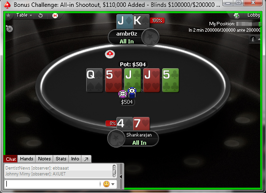 В сегодняшнем шутауте на 10к мне показалось странным что зарегано было 19к+, а по окончанию первого раунда осталось 13к. Тоесть 1700 с хуем столов только в первом раунде сыграли в ничью. Охуеть просто. По окончанию второго было 9к+ Ну и в третьем я закончил на 5к+ позиции. Я хуй знает каким отбитым лудопидором нужно быть что-бы надеяться на победу, поэтому не понимаю хули вы тут раскукарекались. Лучше бы графики спинов повыкладывали, если есть тут те кто по 30+ в день катает хотябы.