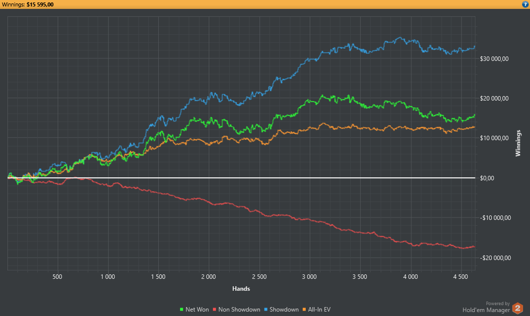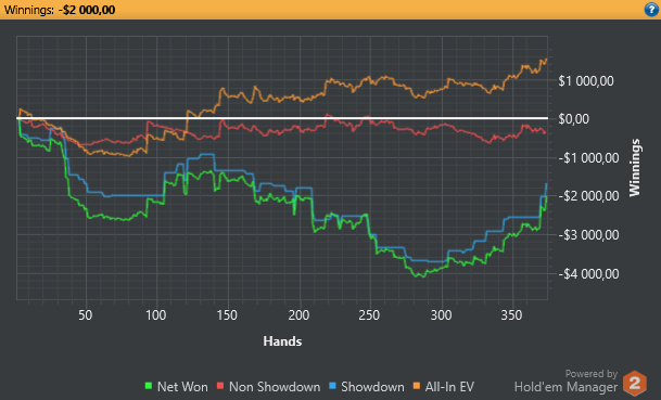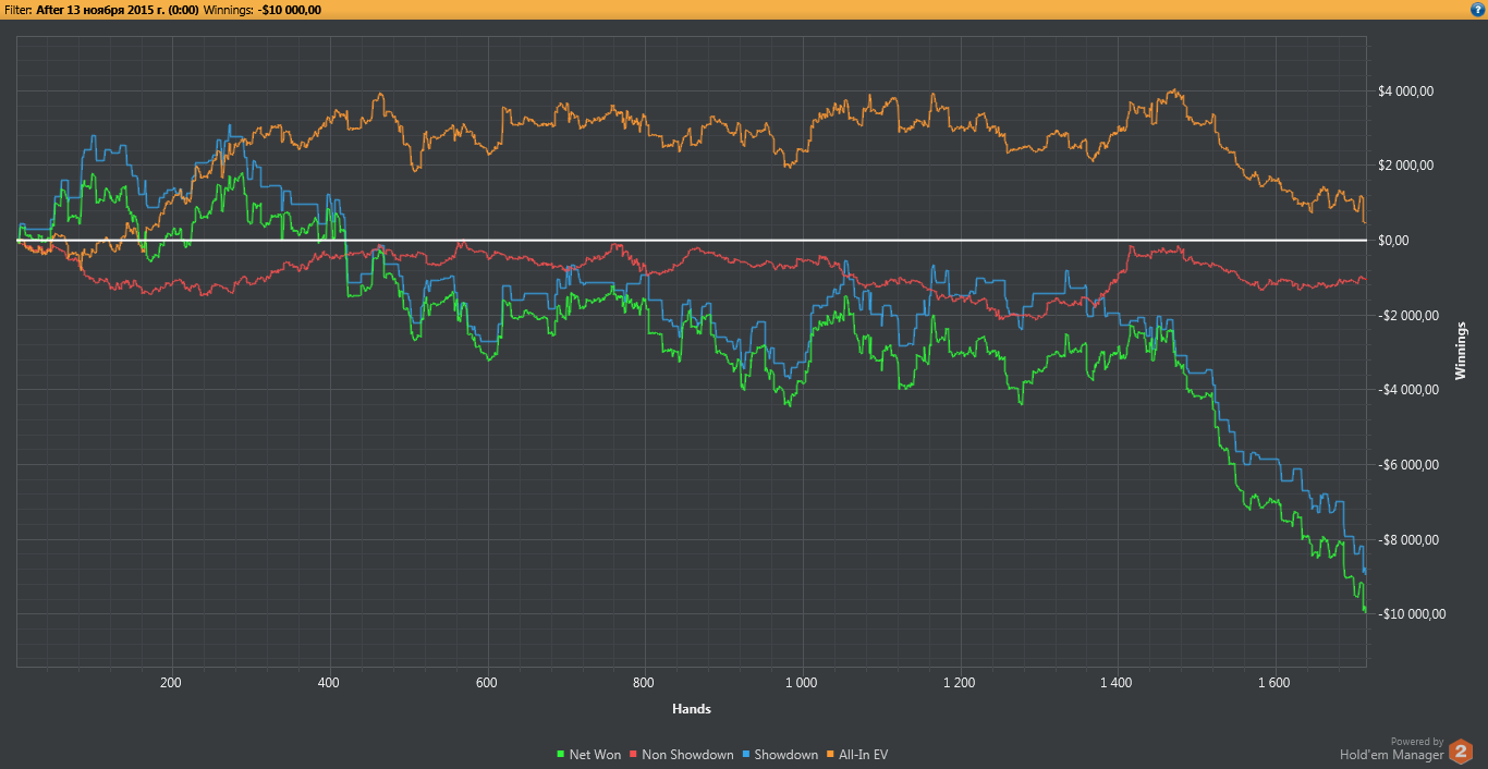 >>31282 Не играй в это дерьмо. Я на лимите в $7 имею такие результаты (пикрил). Иногда выходишь в плюс, а потом как обосрёшься в полосе тильта. В общем somethink like a lottery. Хуита. Мне х120 выпадало ОДИН раз за два года игры. А отыграл я дохуя. Результаты из таблицы - меньше чем за неделю. Денег нет, ещё бы покатал. Обычно ебашу 4 стола. Если психану - 12 столов. Вообще забудь про покер, займись лучше чем другим.