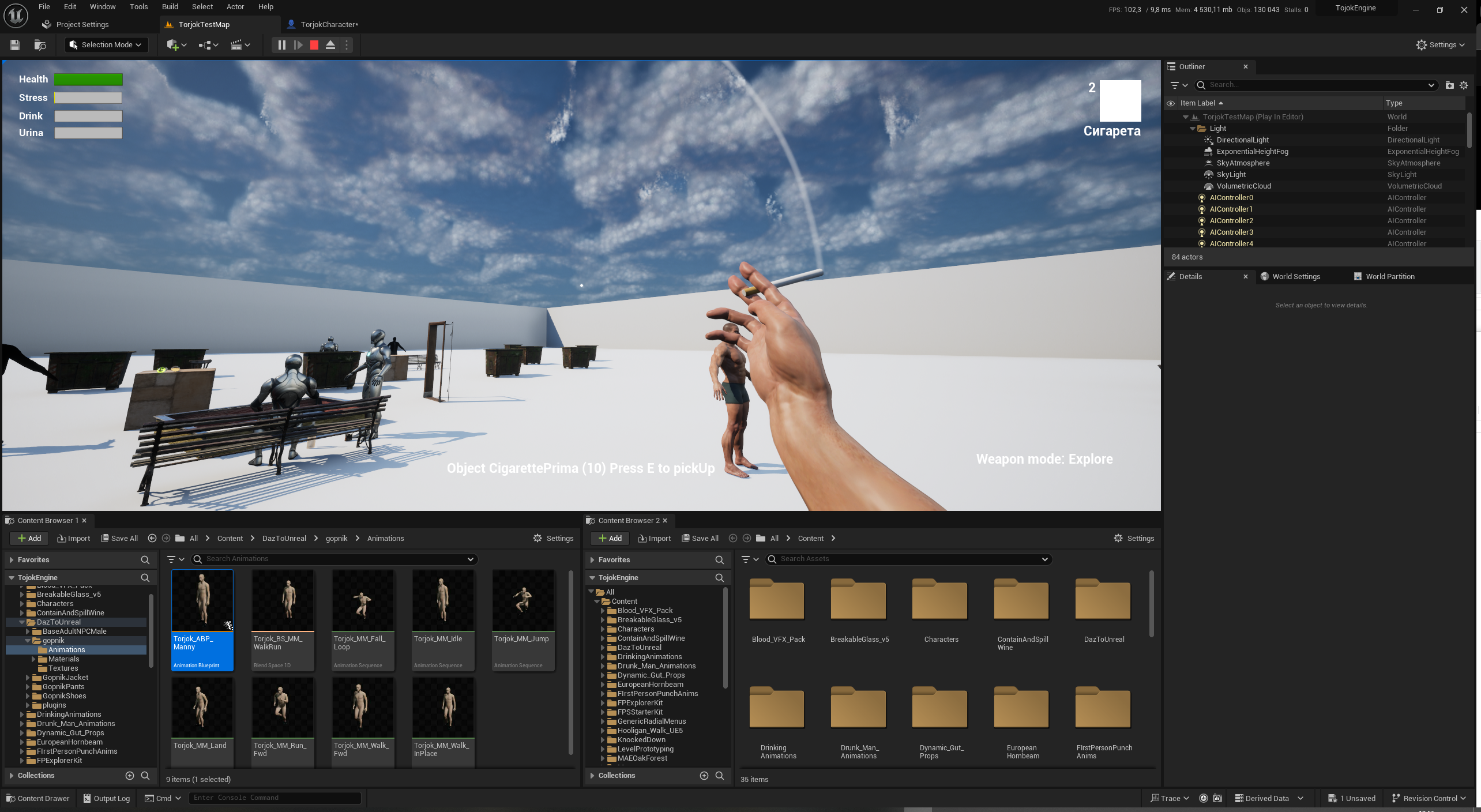 Что имеем на данный момент: Основа игры это эксплоринг+насилие, поэтому решил начать с эксплоринга. Слепил из ассетов и уроков открывание дверей, тумбочек/шкафов, подъем и кидание легких объектов, перетаскивание тяжелых. Начал разбираться в спавне и декалях. Дальше в планах система оружия, кулачный бой/мили/огнестрел. Разваливающиеся тела НПЦ, динамические кишки, сжигание/обосывание/возможность харкать в людей. Потом система квестов, создание локаций, и наполнение игры контентом.