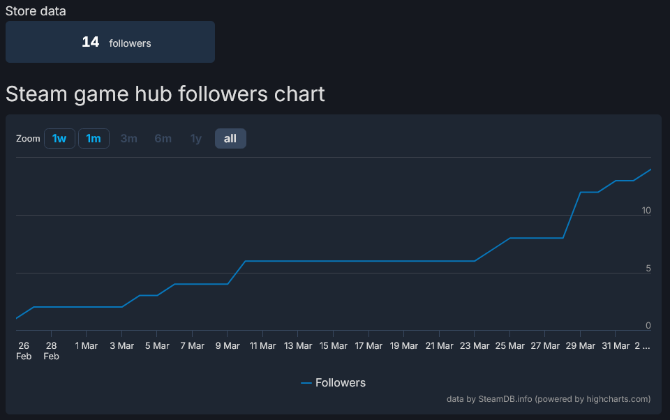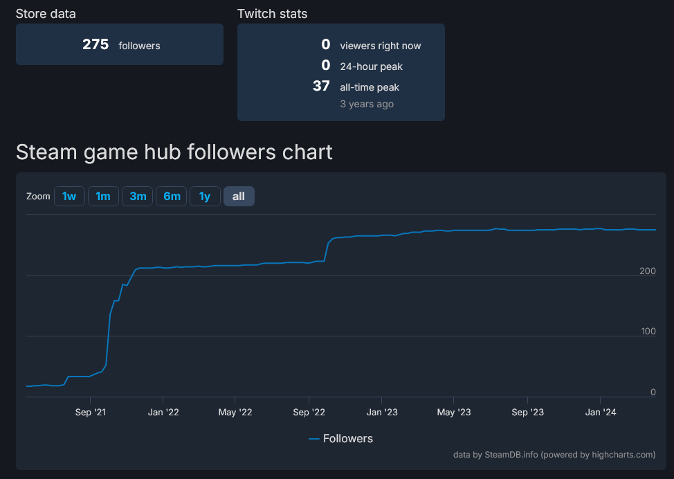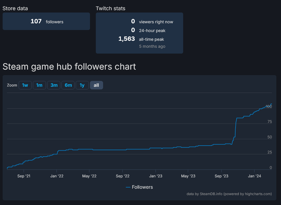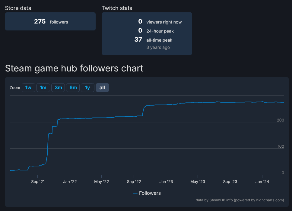 4 года уже маринуют, органика ровный стол уровня +20 фолловеров в месяц. ужасный графен, перекладные анимации. никаких публикаций кроме ведения дев блога с 200 просмотрами. вердикт: безнадега. зачем этой игре издатель, если он ничего не делает?