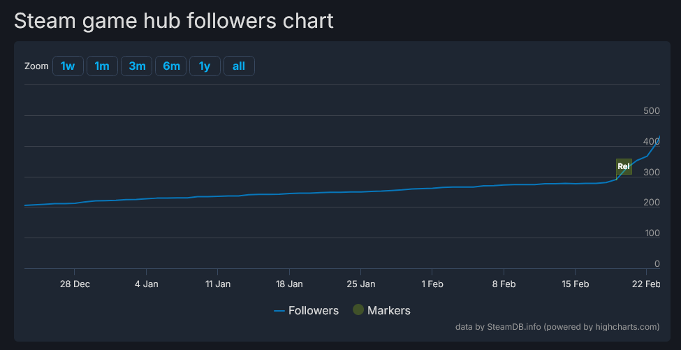 After two weeks, I made another reddit post about the release, it got 900 views, but I also sent out a lot of keys to smaller streamers (between 200 - 2k subs) and I released with a very very low amount of 40 wishlists.