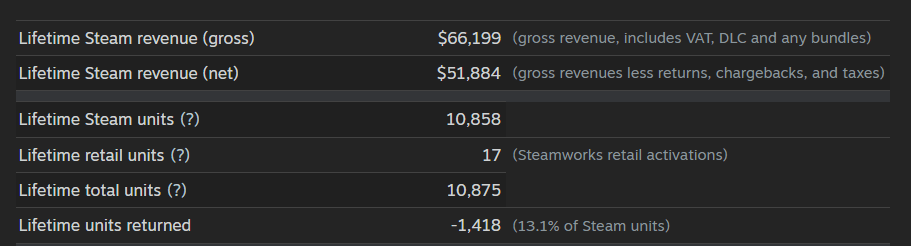 // Just a heads-up for the solo devs out there: these numbers might not look too shabby for you. But for even a small studio, it's kind of a rough situation. Steam takes around 45% off the top with taxes included, and we also have to give a significant chunk to our publisher.