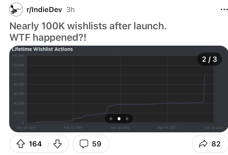 - Подготовил демку к Sim-фесту, который был организован какими-то людьми в стиме (просто фанаты я так понял). За счет траффика с этого сим-феста страница с демкой попала в разделы популярные демо в стиме, что принесло ещё больше вишлистов. - Сделал пост на реддите в разделе PC-Master с рекламой игры куда вставил ту самую наиболее приносящую траффик нарезку геймплея. Пост зашел хорошо и принес 1500 вишлистов. - Пост удалили через 24 часа, из-за того что у Блинцова на реддит аккаунте было больше 10 % рекламных постов. Из чего делаем вывод, что нужно внимательно изучать правила постинга рекламы в социальных сетях. Для реддита по всей видимости нужно организовывать 9 постов о "чём-то" перед тем как сделать один рекламный пост, чтобы не терять вишлисты на пустом месте. - С начала релиза демки закупал рекламу по 50 долларов сутки, буст с сим-феста, буст с реддита, буст в китайских медиа ( видимо всё те же инфлюенсеры, которым игра понравилась), итого за неделю с релиза демки плюс 9000 вишлистов совокупно. - Случайно страничка с игрой попала на Next Fest (фестиваль от стима) хотя на тот момент ещё даже демки не было, это произошло из-за бага стима, но это дало плюс 2000 вишлистов. - За неделю до участия в Next Fest (это уже прямо перед самым релизом игры, я так понял) реклама на твиттере сильно бустанулась давая миллионы просмотров его рекламы из-за чего цена 1 вишлиста с твиттера стоила Блинцову 10 центов в США и 0.9 цента в Европе. Обычно 1 вишлист в США стоит 0.7-1 доллар, чтобы было понятны масштабы. Вдобавок какие-то ещё органические посты инфлюенсеров. Вдобавок рассылка от Terminals.io. Всё это дало увеличение популярности игры на Next Fest.