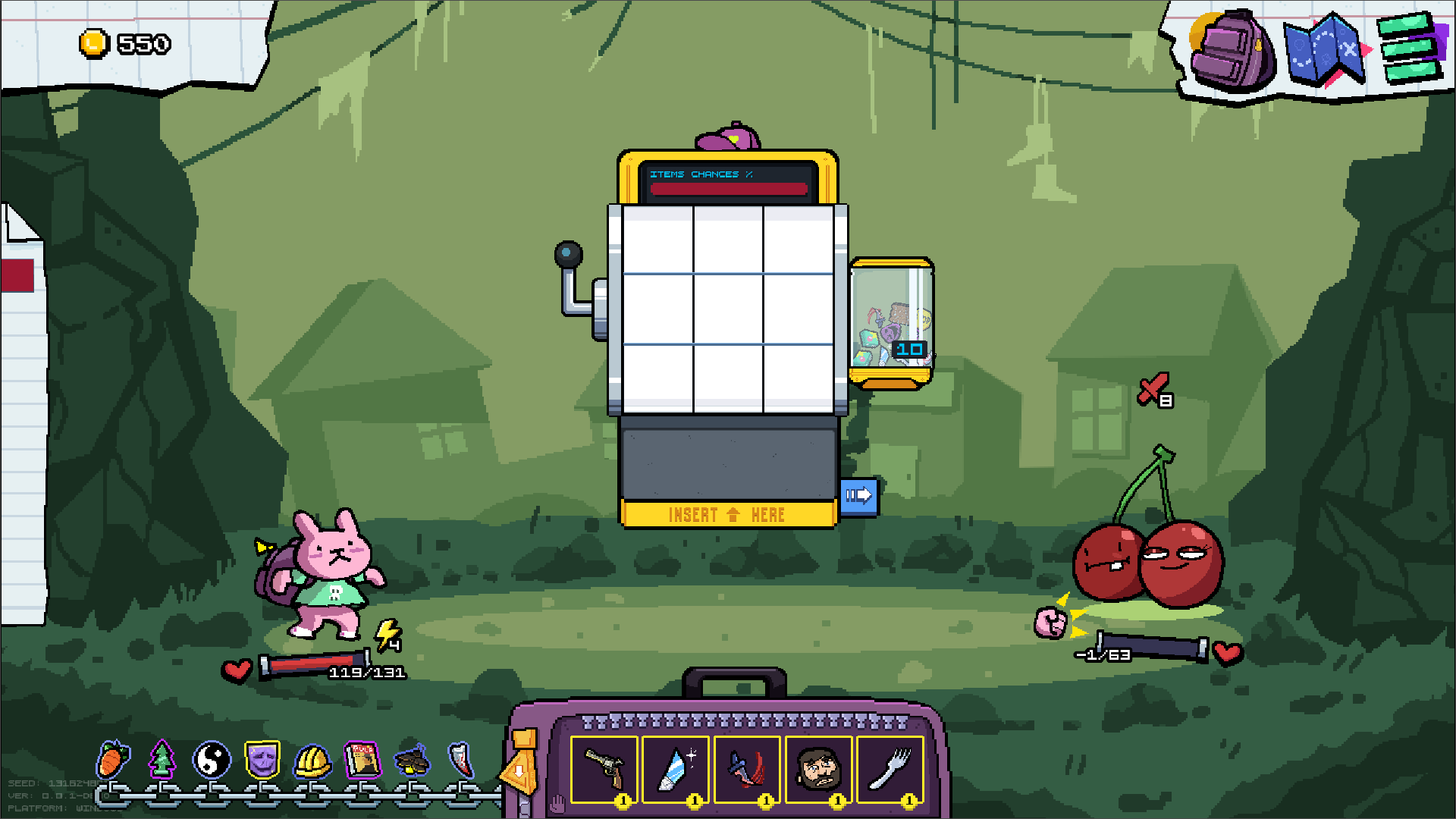 Игра - рогалик слот-машина, где ты закидывая вещи в боевую слот машину ты сражаешься с врагами.