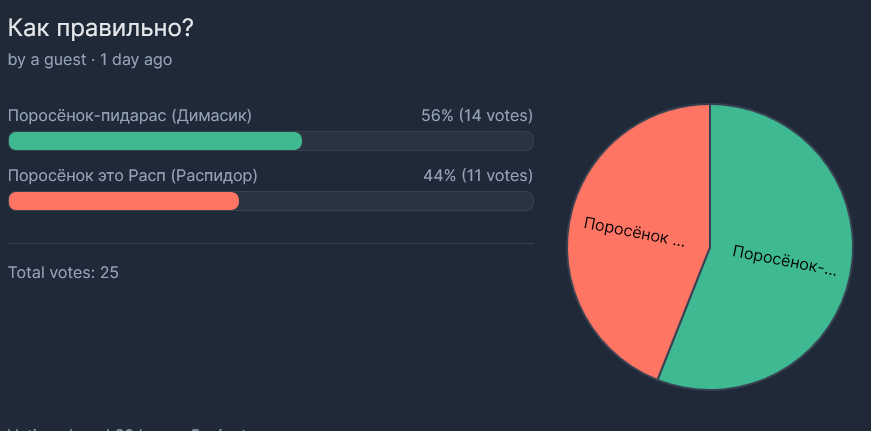 Это опрос вообще был подарком тебе, потому что ПОРОСЁНОК-ПИДАРАС это устоявшийся мем и песня, а твоя жалкая попытка перефорса это всего лишь жалкая попытка перефорса. Я решил дать тебе шанс узаконить хотя бы для этого раздела твой перефорс, но ты взял и обосрался, а теперь визжишь, лишь подтверждая, что ты Поросёнок-пидарас.