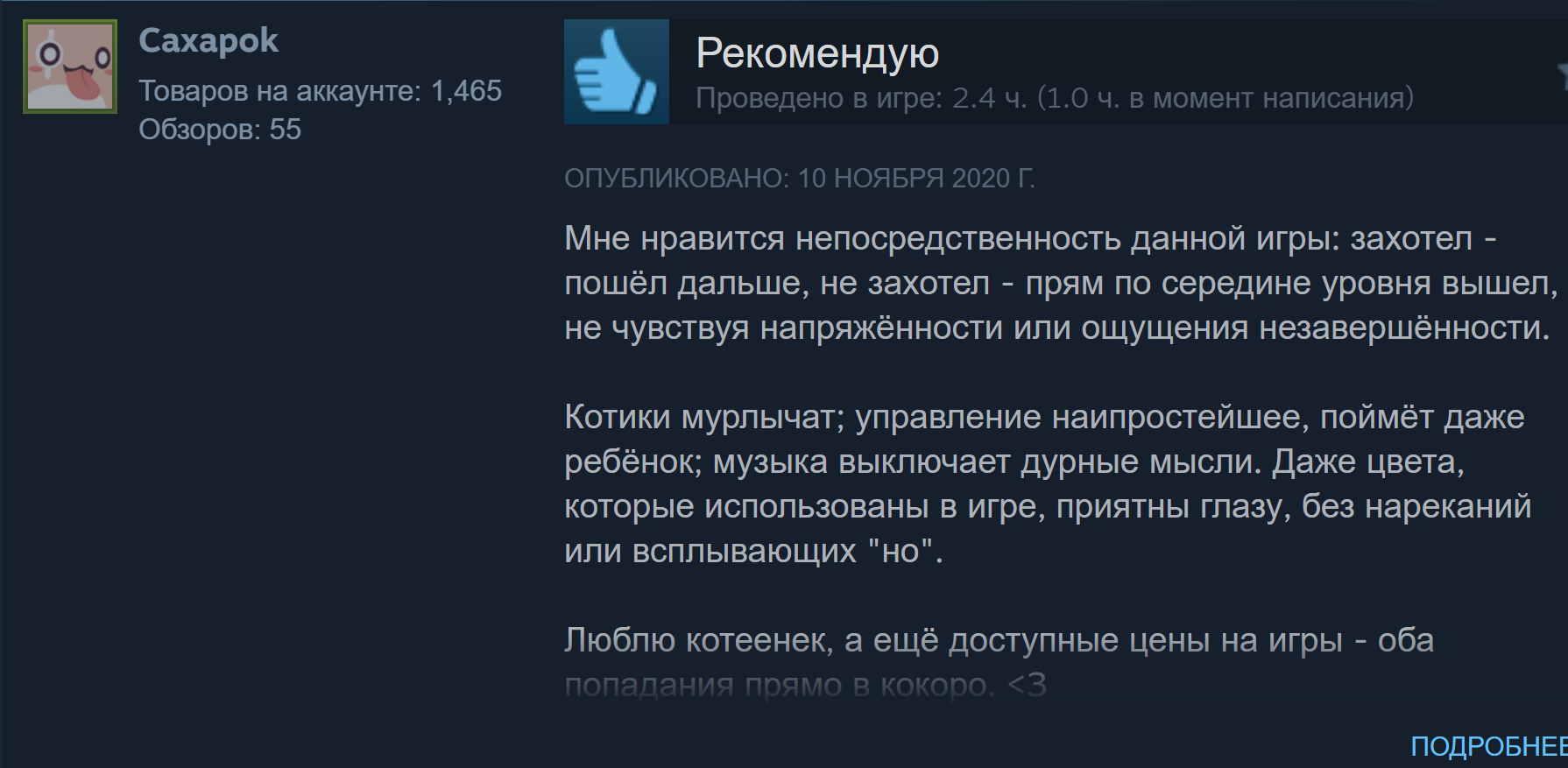 >>1019111 ОП, расскажи лучше какая у тебя динамика вишлистов сейчас? Сколько в день капает? По твоей ссылке игра все же более привлекательно выглядит, в ней значительно больше уникального арта. Каждый кот считай что отдельный арт-объект, художник жопу рвал и поэтому люди считают себя обязанными оплатить труд. У тебя же коты хоть и симпатичные, но стиль очень дженерик и много копипасты.