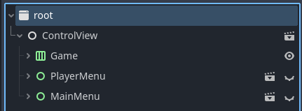 Поясните, насколько кривой подход организации сцен как на пике? ControlView самый большой и главный, ловит инпут и передаёт всем заинтересованным, а так же стейтмашина текущего состояния игры. PlayerMenu и MainMenu - меню инвентаря и прочего и главное меню, хайдятся когда не нужны. Game - туда подгружаются все нужные игровые ноды.