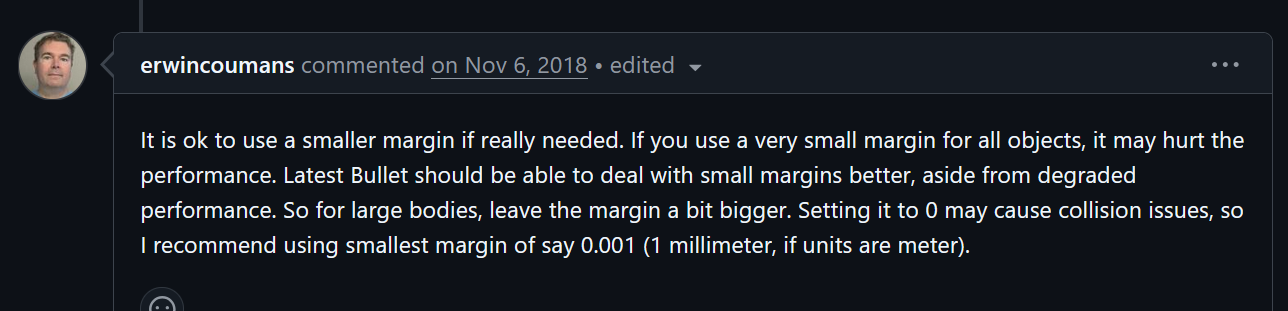 >>1022273 >0.031 увеличить в 2 раза Это мало, еще увеличивай, говорю стандартные размеры должны быть в районе 1, в крайнем случае 0.1. Если у тебя игра про людей, делай им 1-2 метра как в реале. Если игра про микрообъекты то им лучше задать искусственно завышенные размеры, вместо 1мм или 1см тоже 1м. Может оказаться что у тебя уже работает, а на более медленных компах нет. Не уверен, но вроде это получится проверить, поставив более низкий physics tics per second