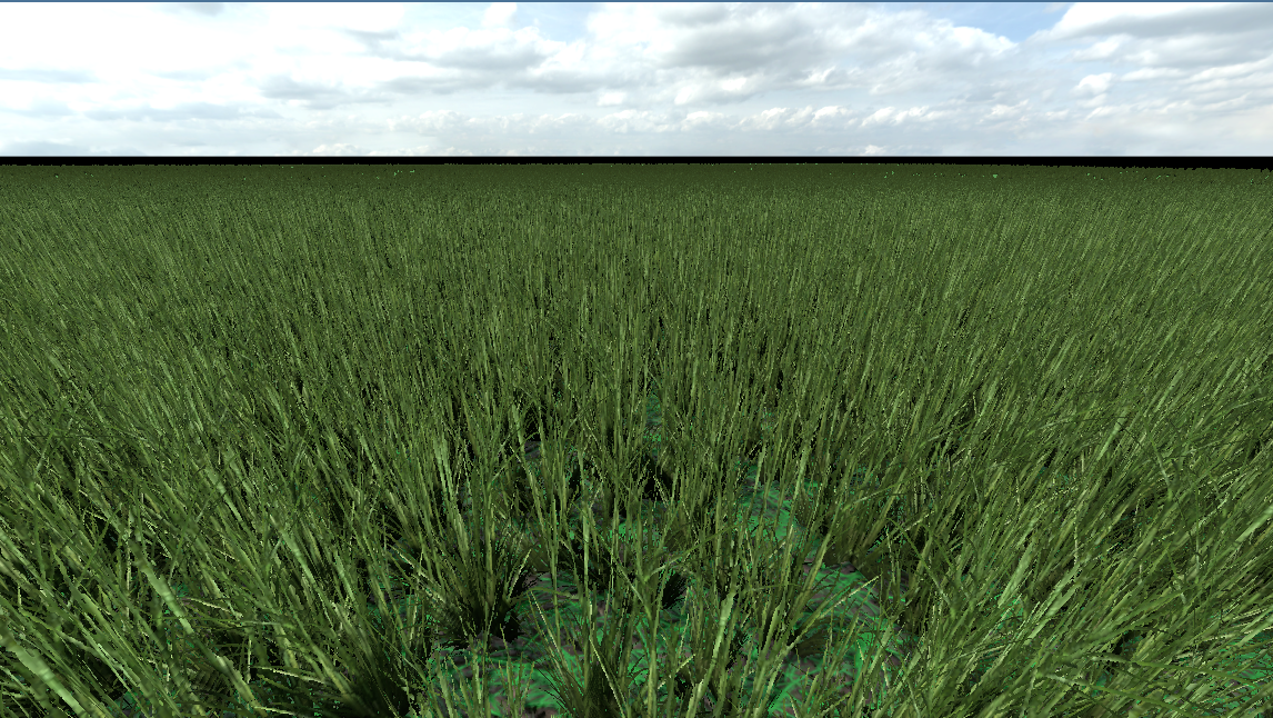 Как я это вижу: - 1 чанк травы == 1 мультимеш; - чем дальше - тем меньше инстансов; - анимация только у чанков вокруг игрока; - самые дальние деградируют в ландшафт; - цвет ландшафта совпадает с цветом травы.