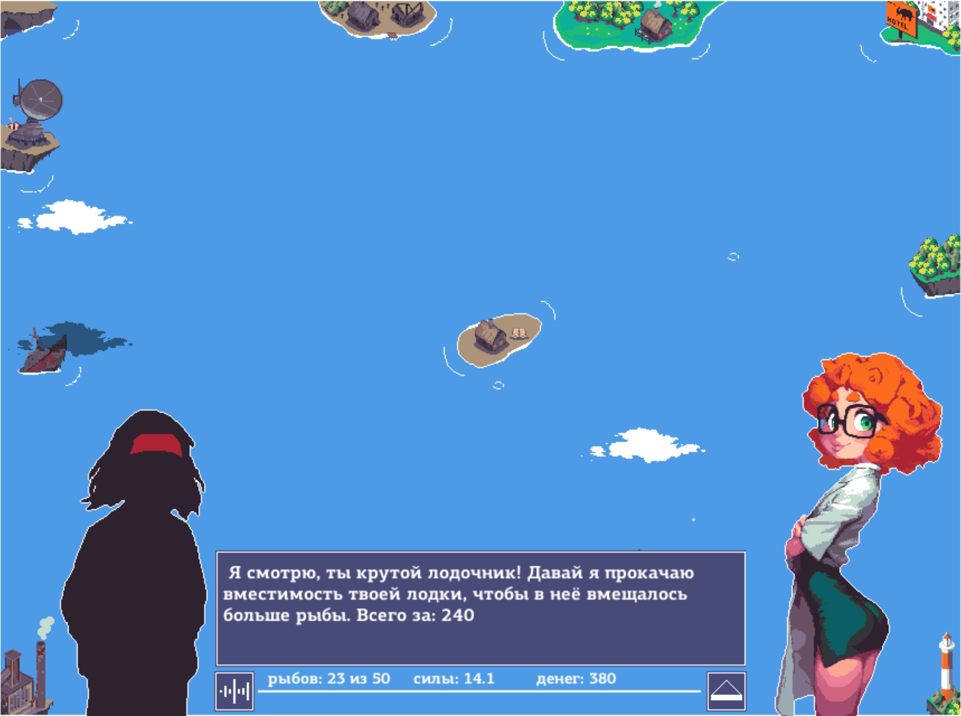 Fiscere Кайфово затянула, наиграл целый час. Приятный геймплей, приятный аудиовизуал. Жопа дымит от круглой коллизии, которая намертво приклеивается к абсолютно шершавой стене и поворачивает тебя лицом в стенку, а скорость поворота доходит до неуправляемости. Самый очевидный квест для лесного "полуострова" - поднять "ловкость" героя, чтобы управление стало чуть более человечным и предсказуемым. Подход к теме: рыба размножается бесконечно