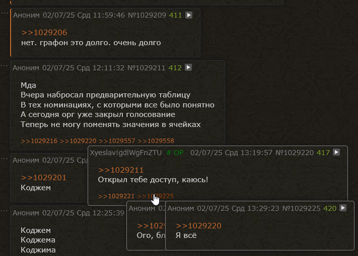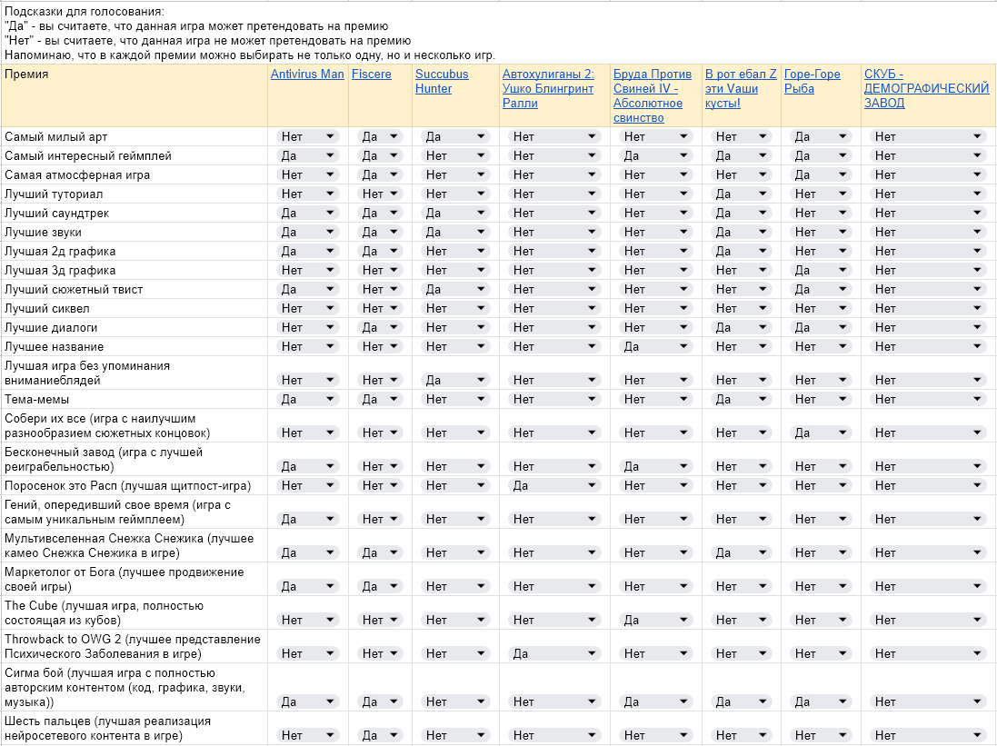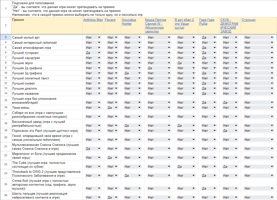 Мда Вчера набросал предварительную таблицу В тех номинациях, с которыми все было понятно А сегодня орг уже закрыл голосование Теперь не могу поменять значения в ячейках