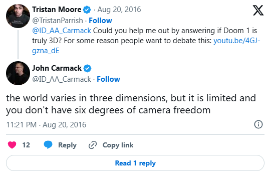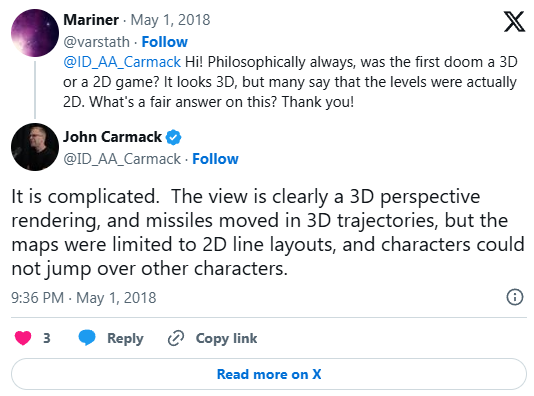>>1029419 Кармак называл дум 2.5д, что является скорее хохмой. И уж тем более он никогда не утверждал что дум двухмерный. Ромеро, кстати, говорил что дум 3д, но кому нахуй интересно мнение человека высравшего дайкатану. >но хоть усрись это не 3д Ты так говоришь потому что услышал от какого-то уебана. Если усадить рандомного человека с глазами играть в дум, то он скажет что это 3д. И тем более нельзя воплотить полностью 2д вид для дума, так чтобы он был полностью аналогичен стандартному думовскому рендерингу в плане функциональности.