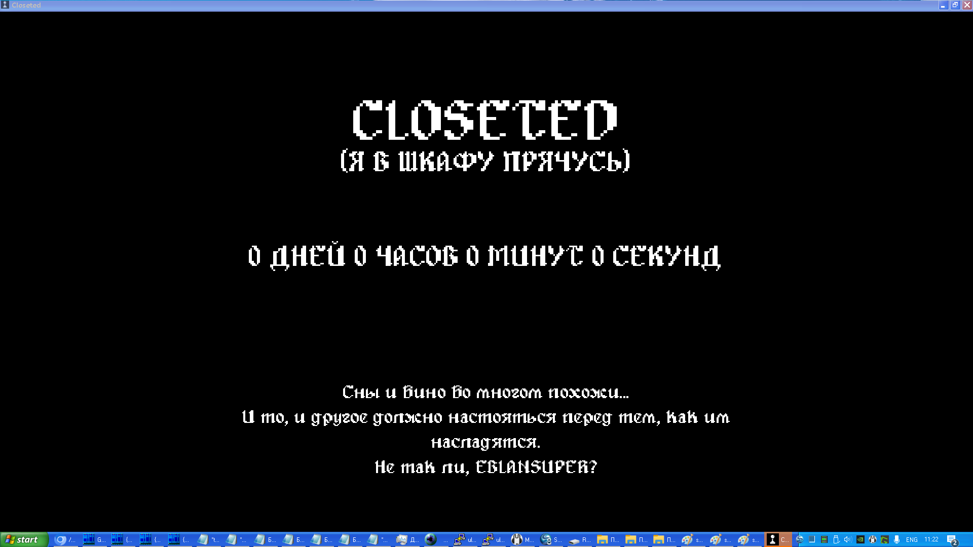Полный деанон сруна: Проводил твг Е. Возмущался темами. Есть сестра Маша. Завайпал тред с игрой Маши. Усирался что сновидение и сон это разные вещи. Усирался что срок конкурса нельзя продлевать. Усирался что в 12:00 заканчивать конкурс тупо. Сейчас усирается по поводу добавленич игры в архив и пиздаболит что делал демку.