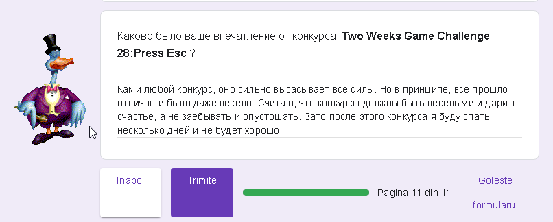 почти Все участники молодцы, игры (из того что успел посмотреть) хорошие сделали. Категорически не согласен с тем же Нульчем, который писал, что игры слабые получились (мне кажется, он так говорит почти каждый конкурс лол). У вас получилось свой проект довести до релиза в такой короткий срок, и это очень круто само по себе, независимо от результата имхо.