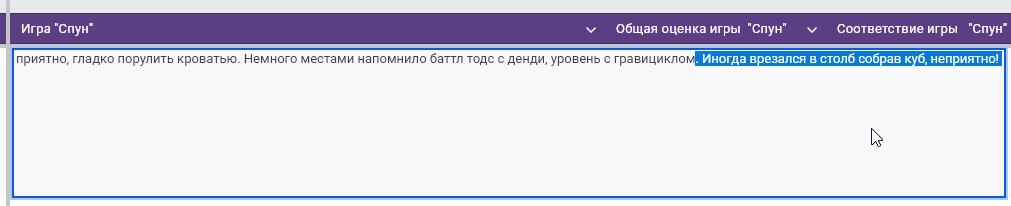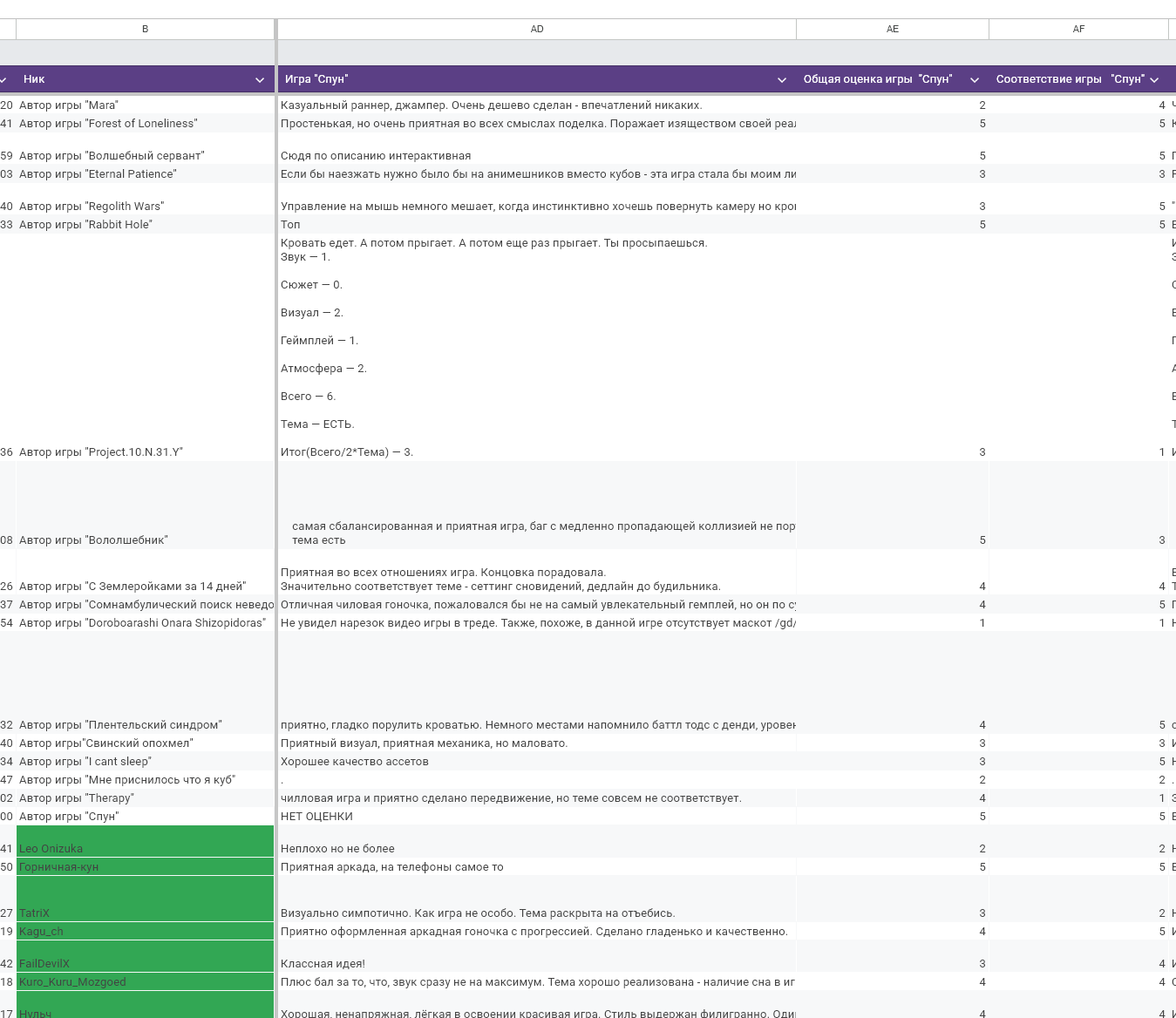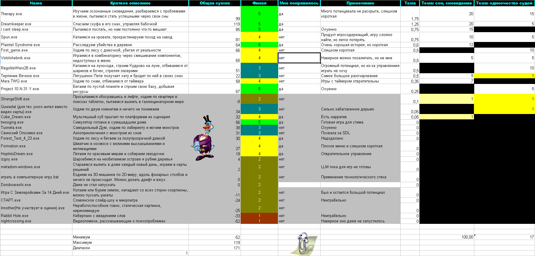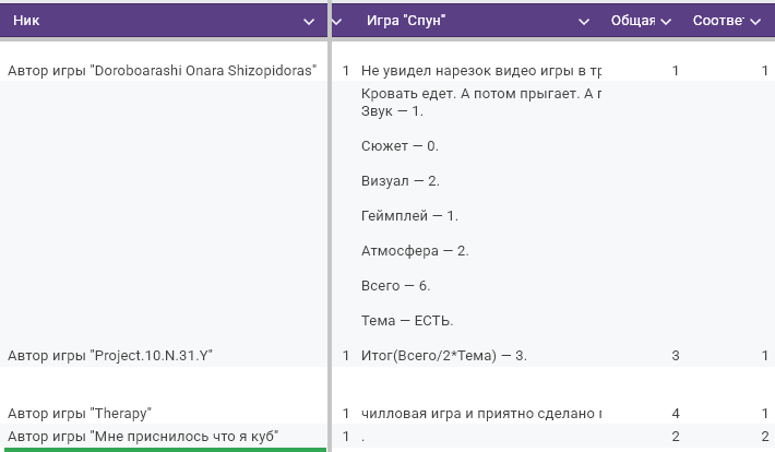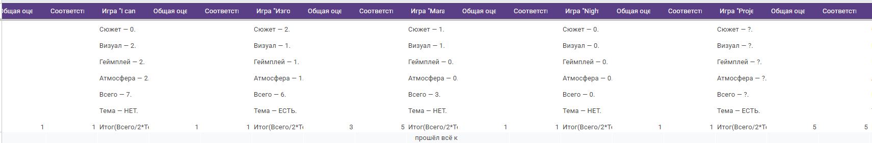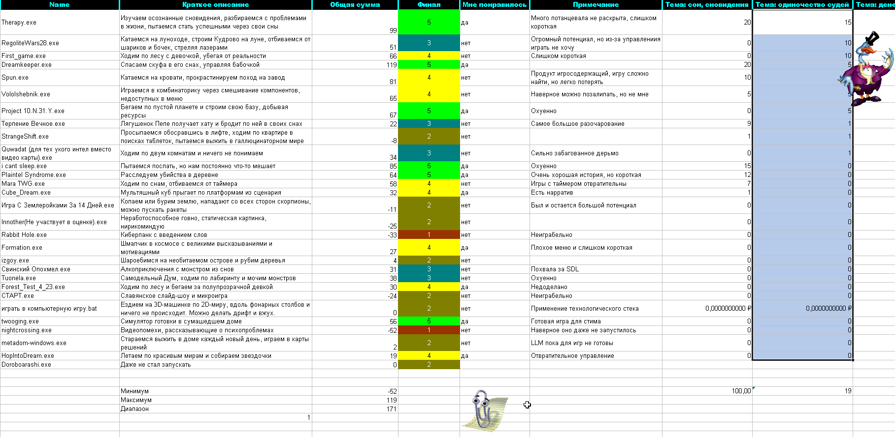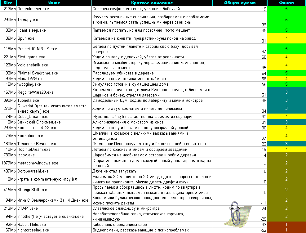 >>1045792 Ну, в отличии от школьников, я все же могу признать свои ошибки. И вот сейчас играюсь с результатами, пытаясь понять, что я сделал не так. Вот тут серым покрасил те игры, которые я бы дисквалифицировал. А стыдно потому, что я им поставил высокие оценки как таковые, так как игры реально хорошие. И значит, что я все же способствовал их продвижению.