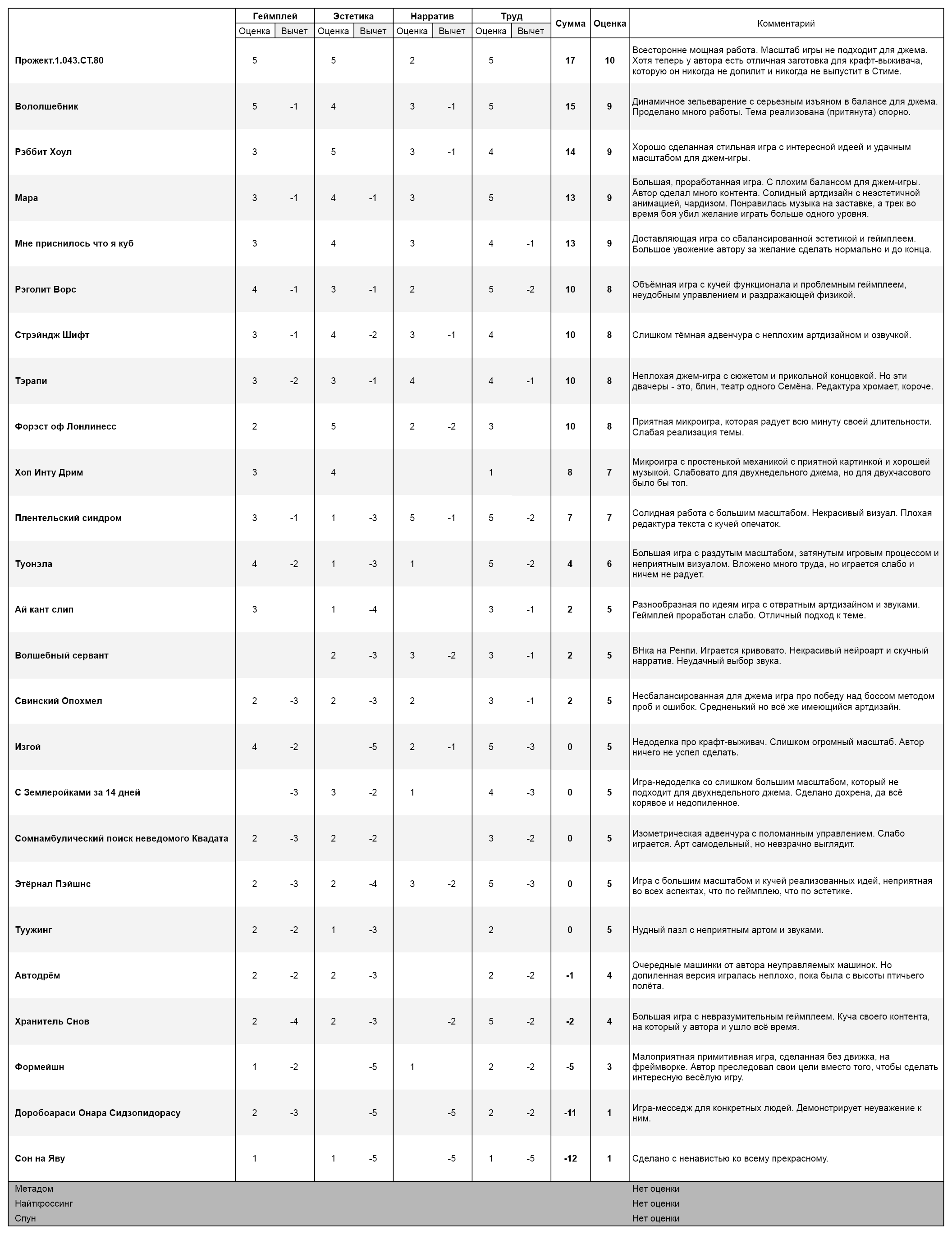 Оценка имеет вид +5 -2: первое число это мощность в категории, а второе это вычет недостатков (баги, хуёвые спрайты, противные звуки). Чтобы можно было отличить слабо проработанные категории от сильно проработанных с серьёзными недостатками.