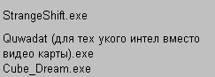Вот этим я выдал по 1 баллу соответствия теме: StrangeShift.exe Quwadat (для тех укого интел вместо видео карты).exe Cube_Dream.exe