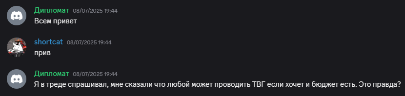 >>1045503 Не проецируй себя на меня. Я обычный нормис. И конечно надеюсь что рано или поздно получится либо ТВГ вывести на нормальный уровень, либо ещё что то, и проводить нормальные геймджемы, типа как вон Андрюша выбрался в Сибирский и ему збс. Это то, к чему надо стремится. Мне кажется часть других оргов тоже это понимают и хотят больший уровень цивилизованности. А возня шизов и обидные игры про протыков - никому из адекватов не нужны.
