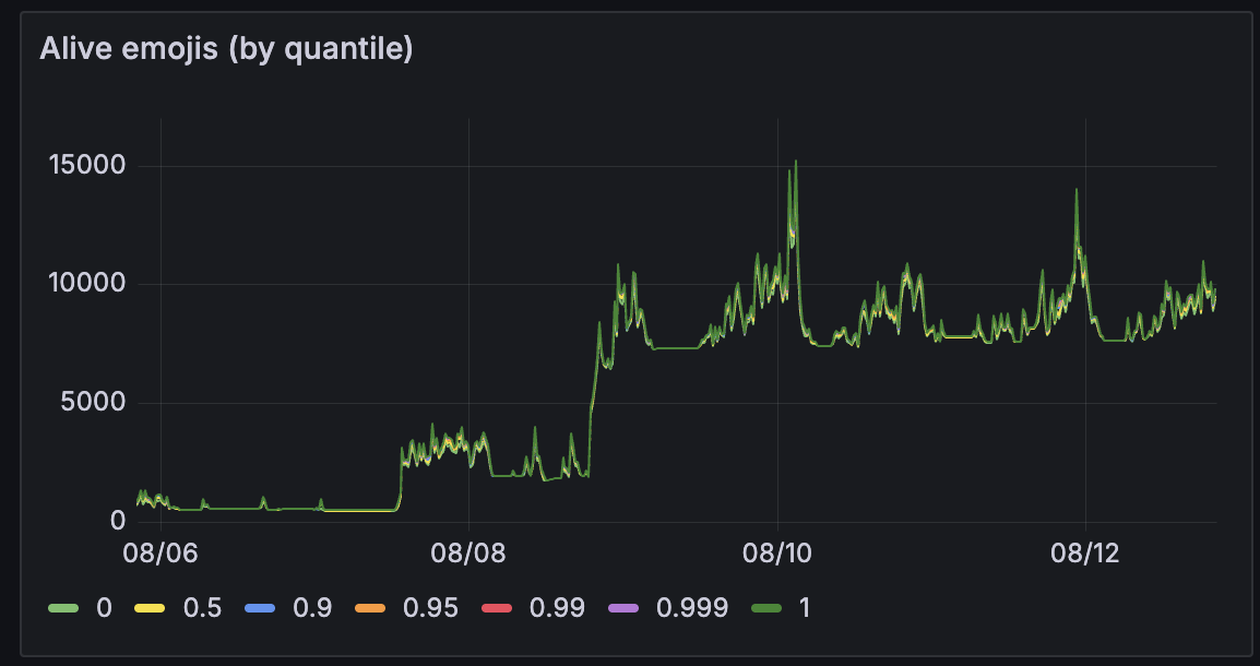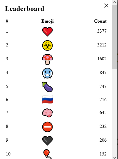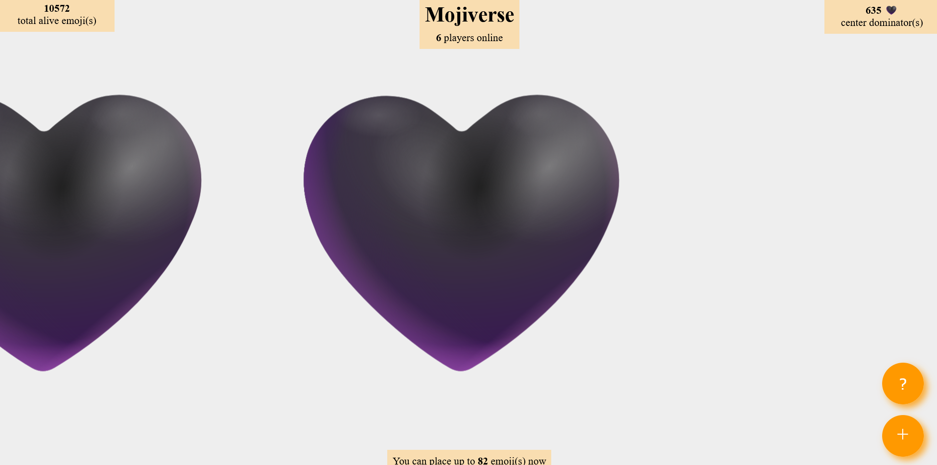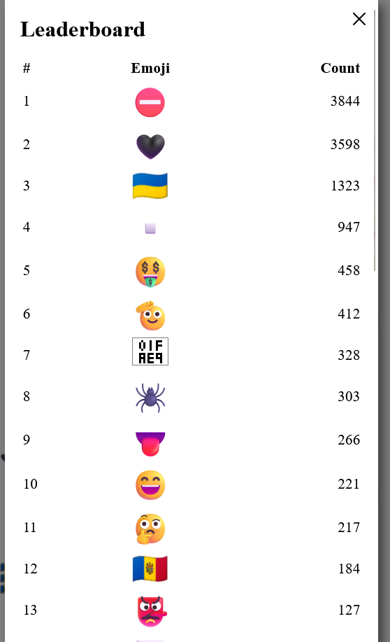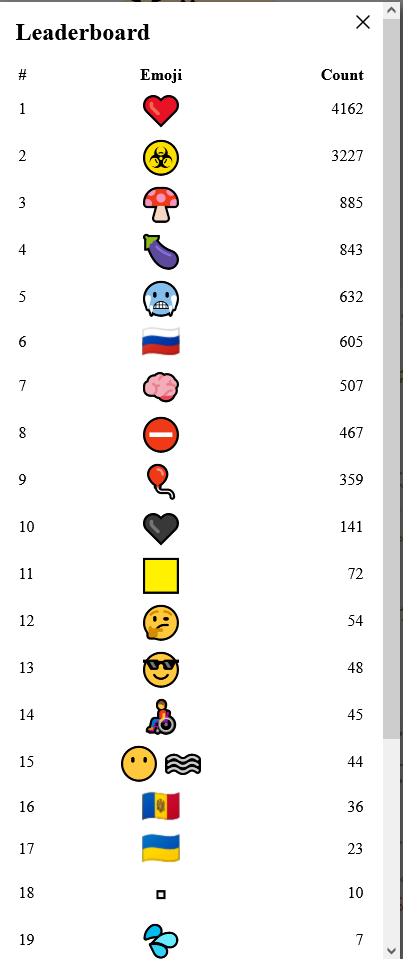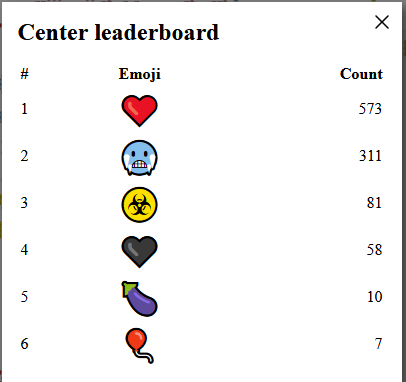 Есть статистика по количеству живых эмодзи на всей доске и отдельно в центре - открывается по кликам по соответствующим верхним углам страницы.