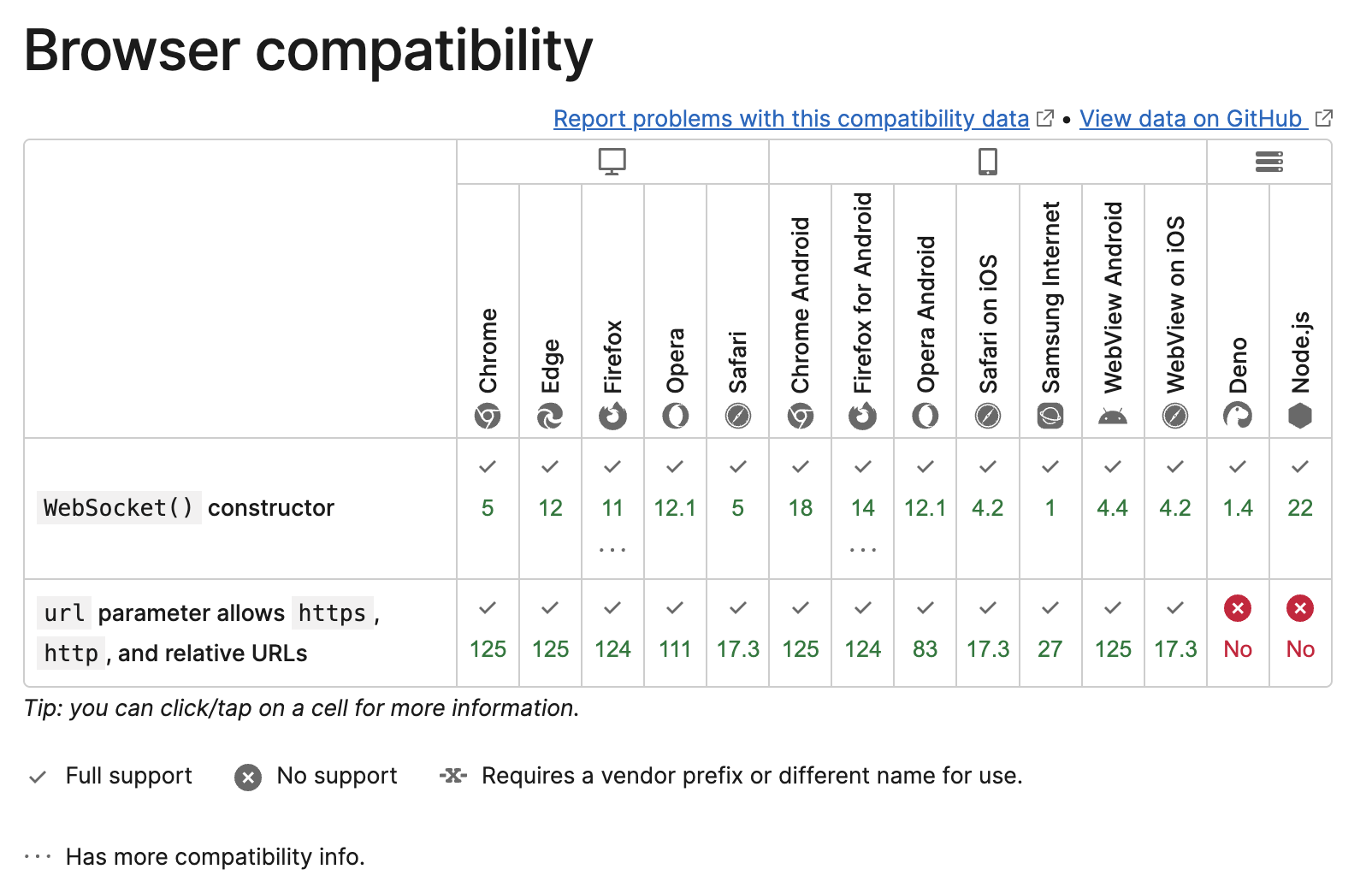 >>1047108 Потому что поддержка относительных url подключений веб-сокетов появилась позже, чем сами веб-сокеты. Смотри вторую строчку в таблице. Если твой браузер старее, то там не работают относительные url для веб-сокетов, надо всегда указывать абсолютные.