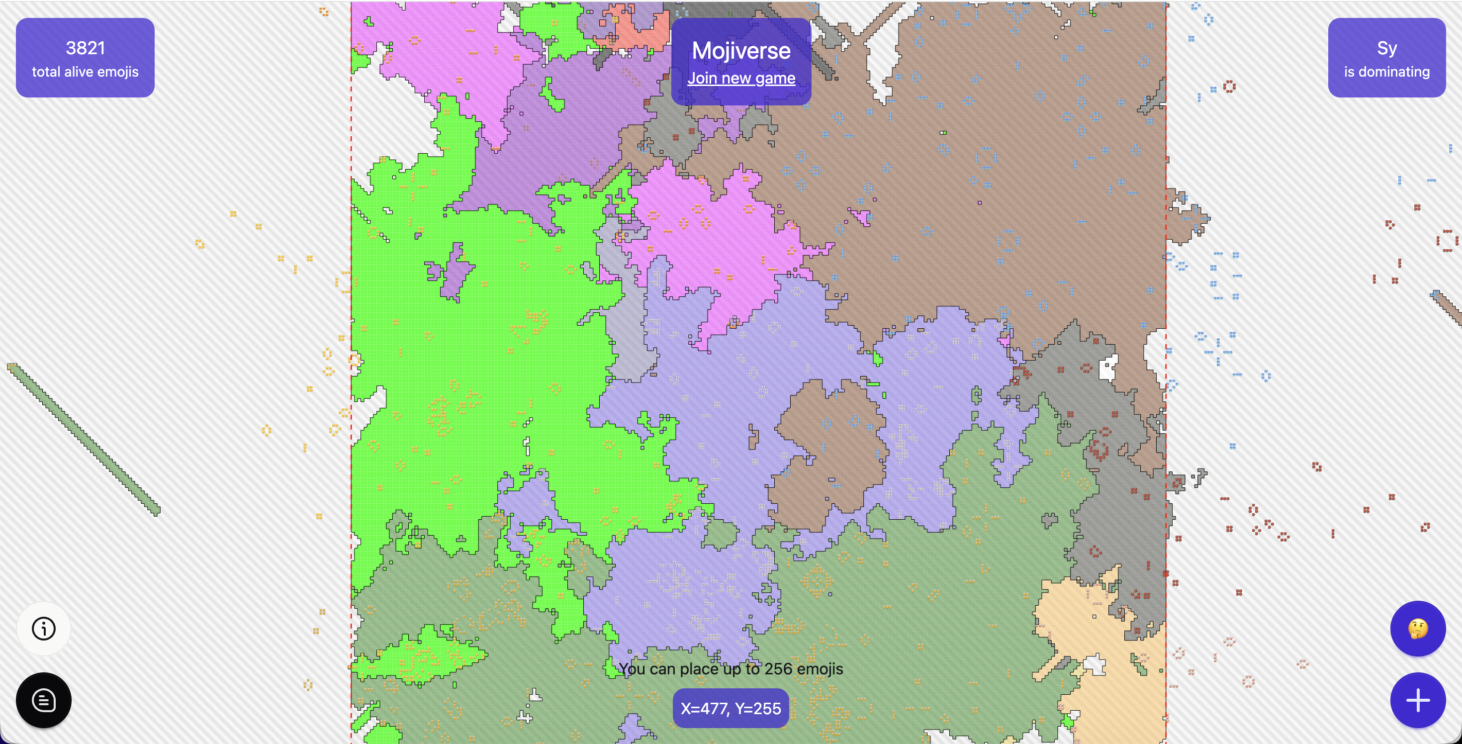 Игроки ставят эмоджи на онлайн доске, а игра каждую секунду проводит симуляцию. Если у эмоджи меньше 2 соседей он умирает от одиночества, если больше 3 - от перенаселения. Если вокруг пустой клетки ровно 3 змоджи, то в ней тоже спаунится эмоджи (определяется по большинству соседей).